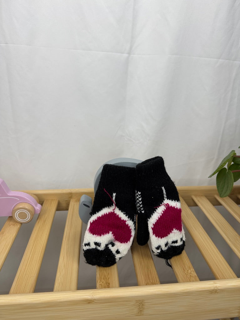 Roztomilé zimní pletené palčáky ve velikosti 98/104. Tyto rukavice zaujmou výrazným designem s červenými srdíčky a kontrastním černo-bílým vzorem. Praktické provedení se šňůrkou zabrání ztrátě rukavic během her venku. Perfektní doplněk pro dívčí zimní výbavu, který nejen zahřeje, ale i krásně doladí outfit.