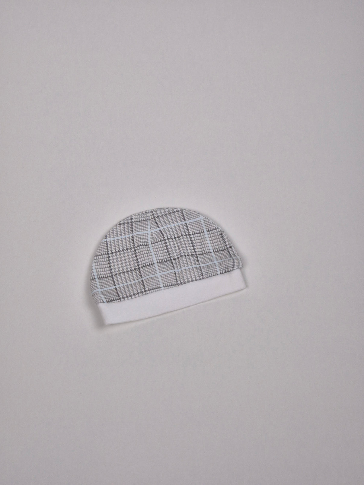Stylová novorozenecká čepička ve velikosti 56 v elegantním šedo-bílém kostkovaném vzoru. Díky pružnému lemu dobře drží na hlavičce a je příjemná na nošení.