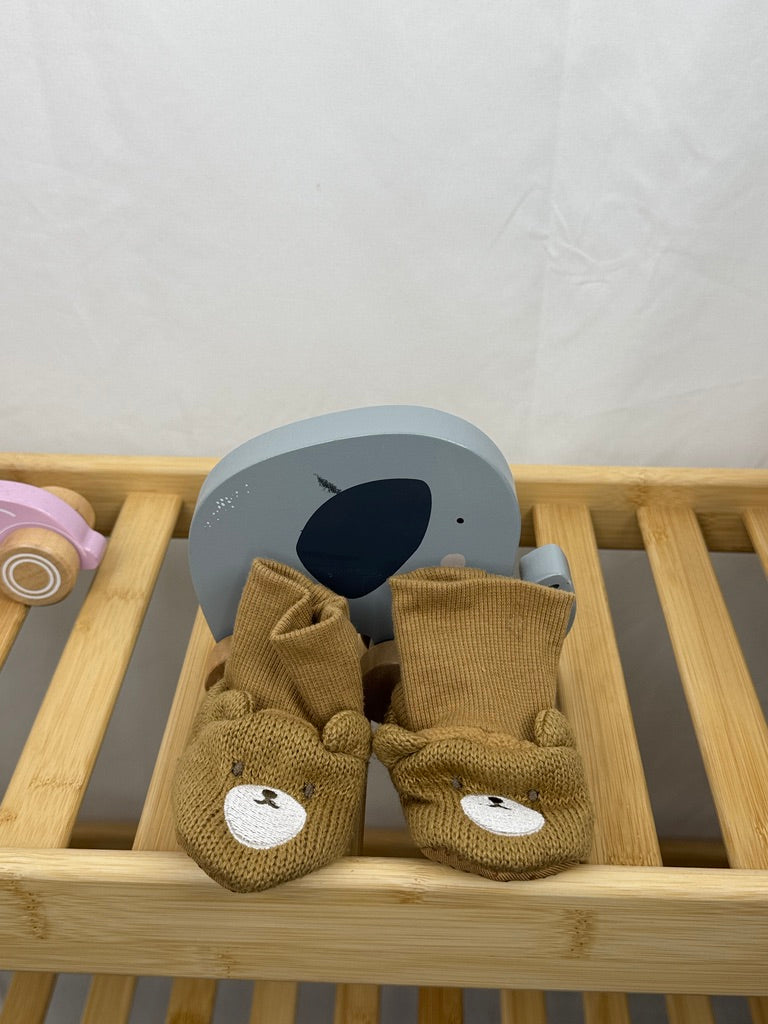 Hnědé protiskluzové capáčky s motivem medvídka 0-6m.