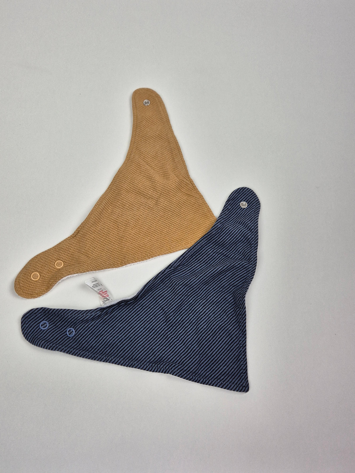 Praktická sada dvou trojúhelníkových slintáčků v krásně sladěných barvách. Jeden kousek v teplém karamelově hnědém odstínu s jemnou strukturou, druhý v klidné šedomodré barvě. Z vnitřní strany mají savý froté materiál, který dobře zachytí sliny i drobné nehody během dne. Zapínání na druk umožňuje snadné nastavení kolem krku a pohodlné nošení.