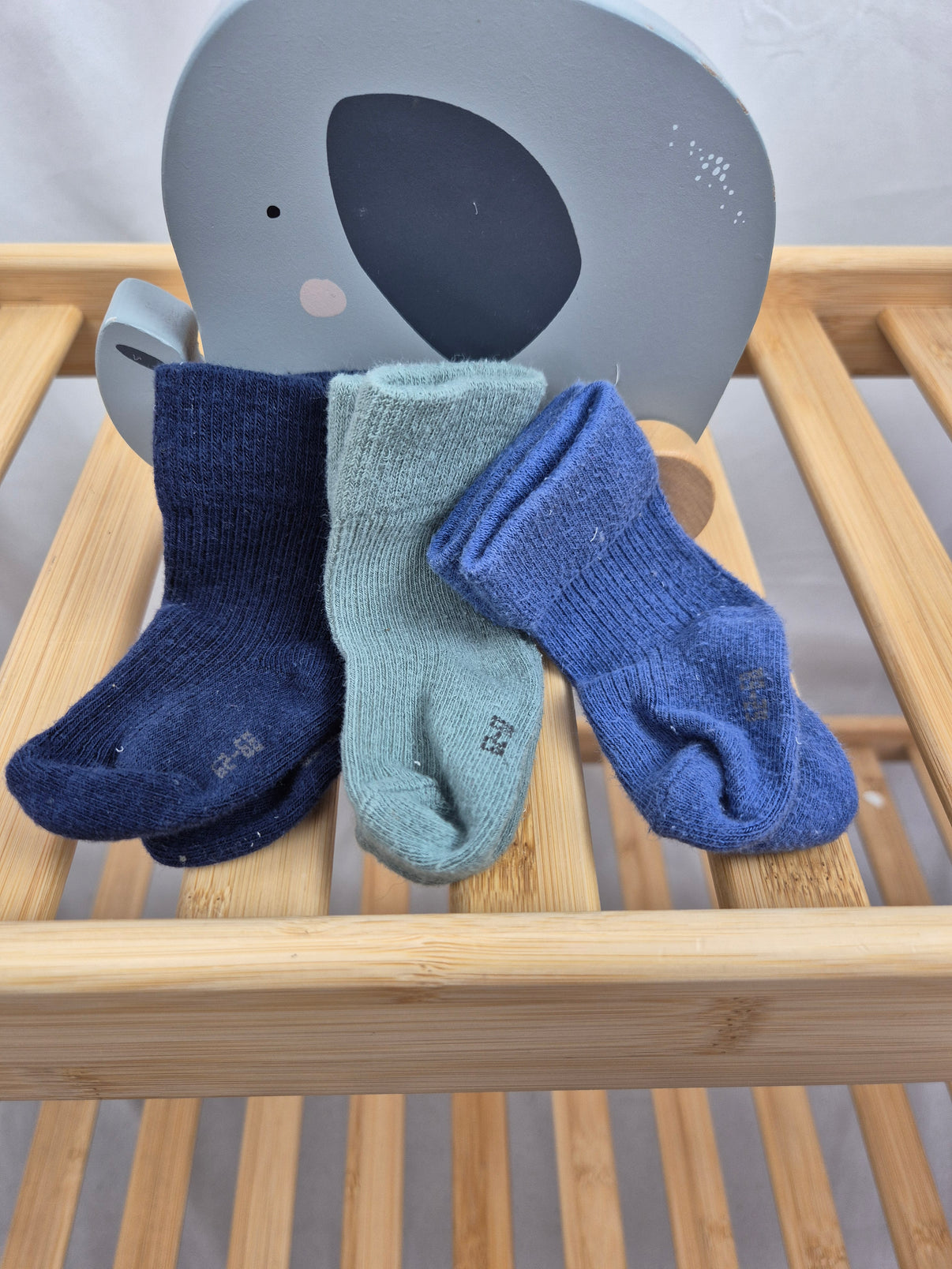 Pohodlná sada tří párů ponožek ve veselých chlapeckých barvách – tmavě modré, světle petrolejové a modrofialové. Ideální pro každodenní nošení – ať už do kočárku, na první krůčky nebo jen tak na doma. Měkký a pružný materiál zaručuje pohodlí i snadné oblékání. Velikost odpovídá 62/68, tedy přibližně věku 2–6 měsíců.