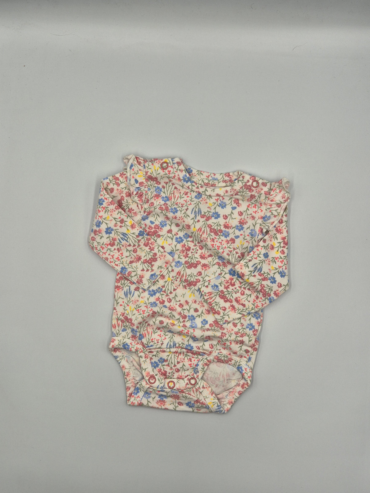 Něžné body s dlouhým rukávem v krémovém základu zdobené jemným květinovým vzorem v odstínech růžové, modré, žluté a zelené působí velmi romanticky a svěže. Drobný volánek na ramenou dodává kousku ještě roztomilejší vzhled.