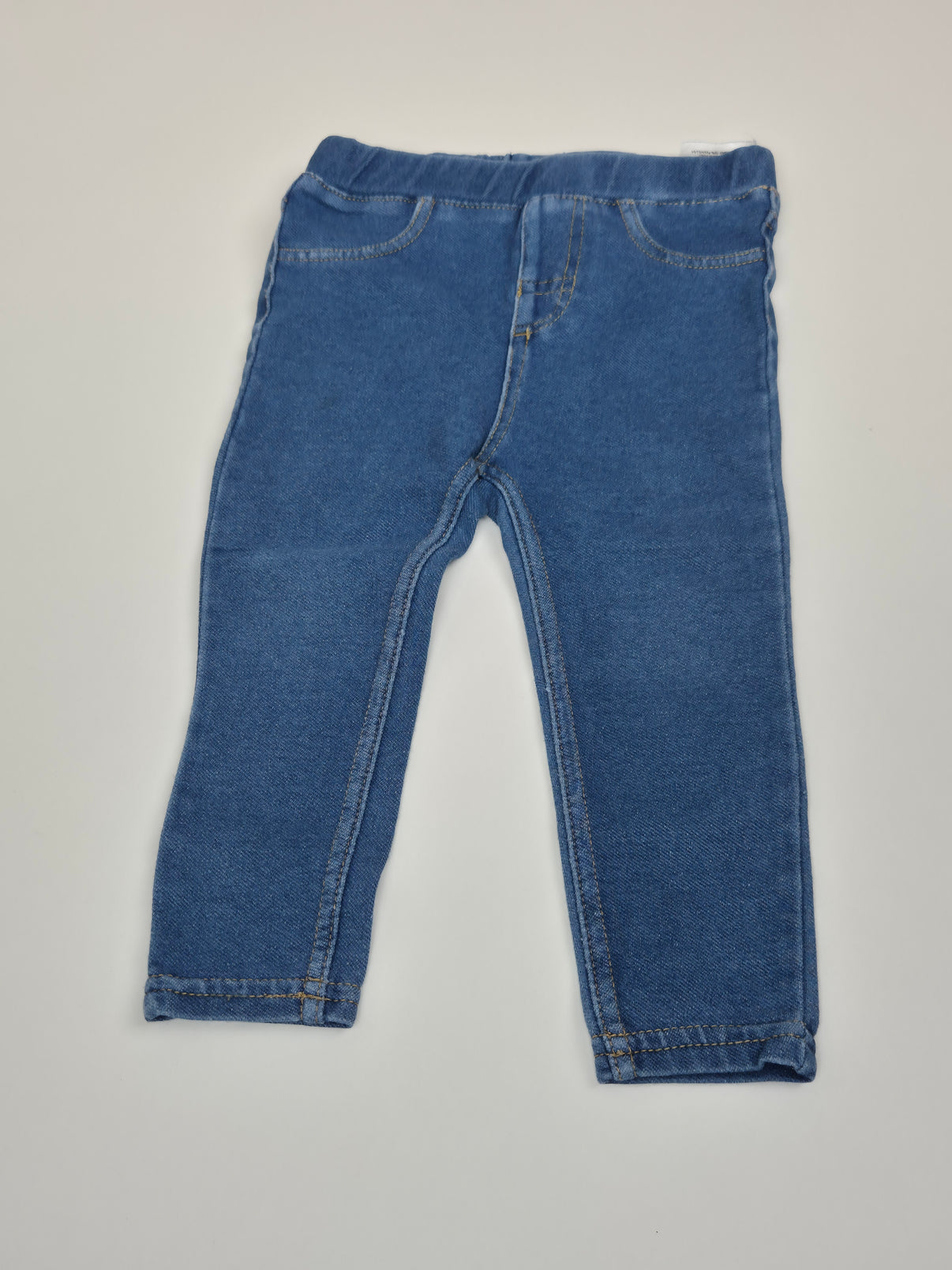 Modré džegíny od H&M ve velikosti 80 – pohodlný a univerzální kousek na každý den. Jsou z měkkého, lehce pružného materiálu, takže se krásně přizpůsobí pohybu dítěte, ale zároveň mají vzhled klasických džín. V pase je široká pružná guma, která nikde netlačí, a falešné kapsy dodávají kalhotám džínsový vzhled. Skvělé na běžné nošení, do školky i na hřiště.