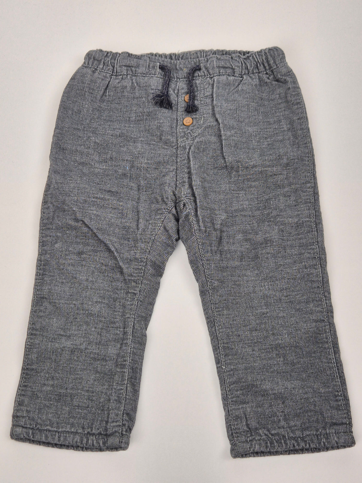 Stylové dětské kalhoty z H&M ve velikosti 86 v šedém melírovaném odstínu s jemným žebrováním, které působí skoro jako manšestr. Elastický pas se šňůrkou a dekorativní knoflíčky dodávají kalhotám ležérní vzhled. Jsou pohodlné, ale zároveň vypadají elegantněji než klasické tepláky – skvělá volba na návštěvu i běžný den. Díky neutrální barvě se hodí jak pro kluky, tak pro holčičky.