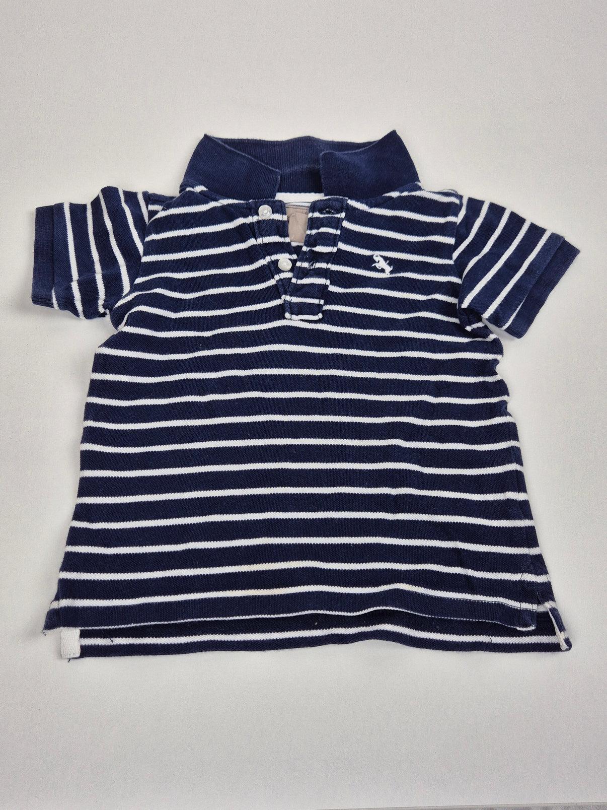 Námořnicky laděné polotričko H&M ve velikosti 86 v klasické kombinaci tmavě modré a bílé. Má jemný proužek, límeček z pevnějšího úpletu a zapínání na tři knoflíčky pro snadné oblékání. Na hrudi je malé logo lva v bílé barvě.