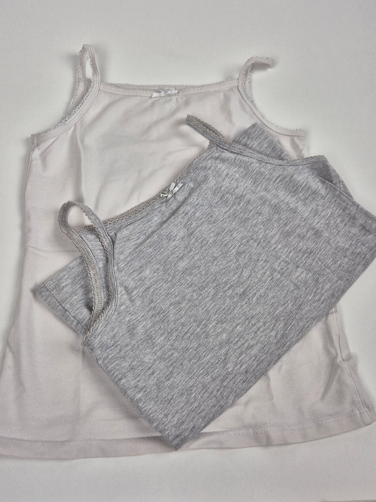 Praktická dvojice dívčích tílek v jemných barvách – světle šedá a světle růžová. Každé má tenká ramínka a decentní ozdobnou mašličku u výstřihu. Díky příjemnému bavlněnému materiálu jsou ideální jako spodní prádlo pod svetr či tričko, ale i samostatně na horké letní dny.