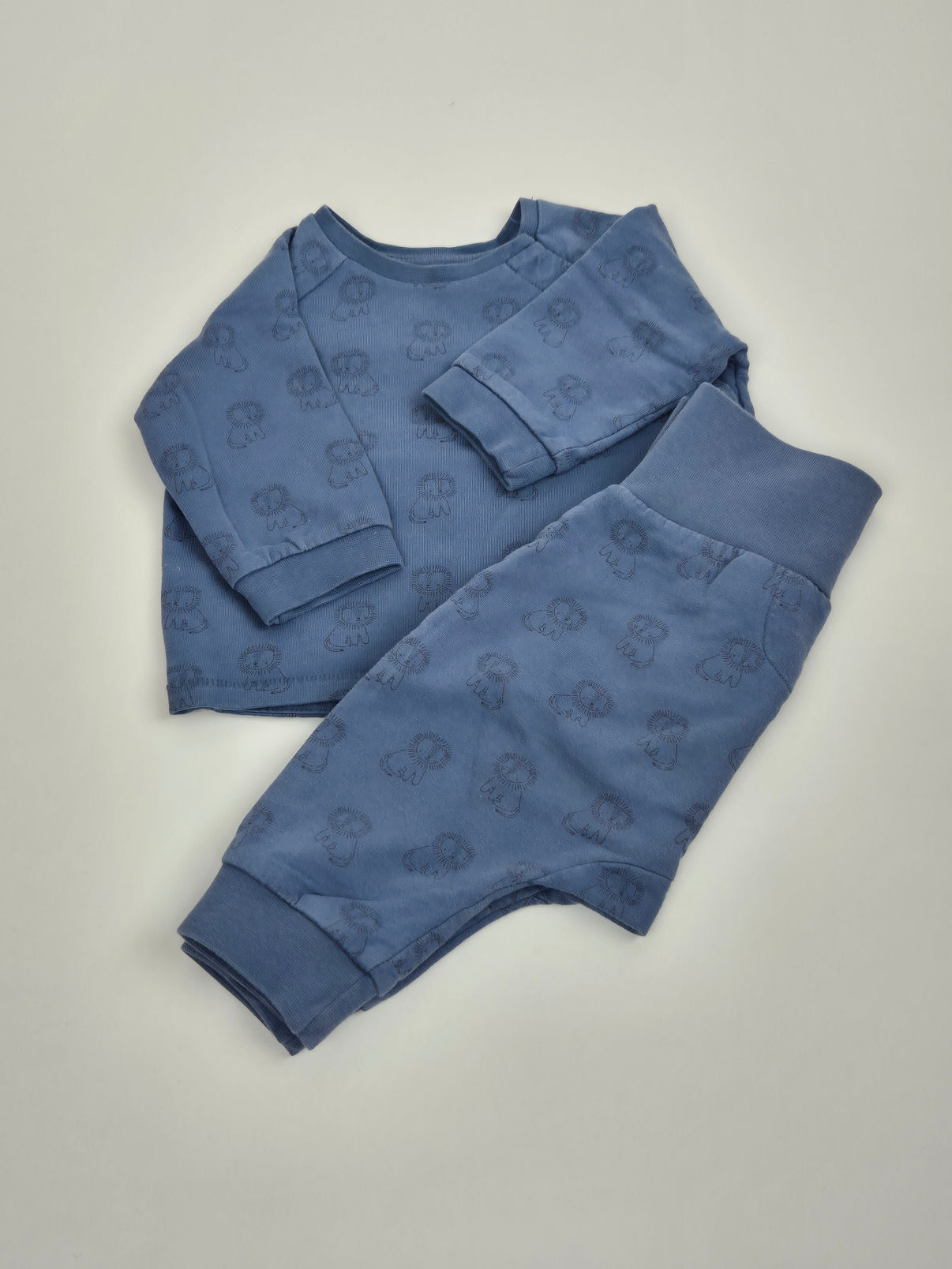 Pohodlná kojenecká tepláková souprava H&M v krásné tlumené modré barvě s jemným celoplošným potiskem lvíčků. Mikina má jednoduchý střih s pružným lemem u krku, zatímco kalhoty jsou vybavené měkkým pasem...