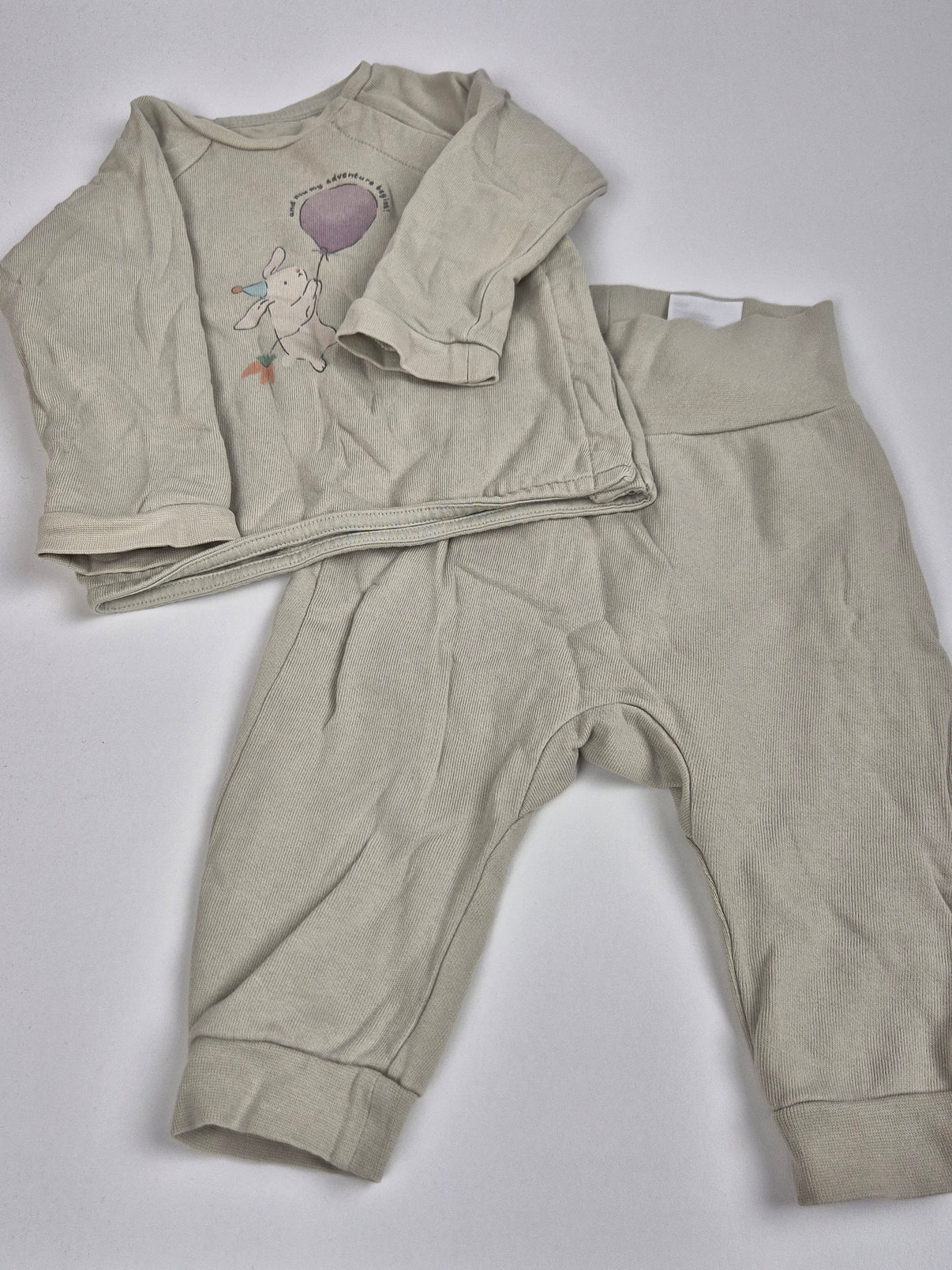 Měkoučká tepláková souprava H&M ve velikosti 74, vhodná pro kluky i holčičky. V neutrální béžové barvě, skládá se z trička s dlouhým rukávem a potiskem zajíčka s balónkem a pohodlných...