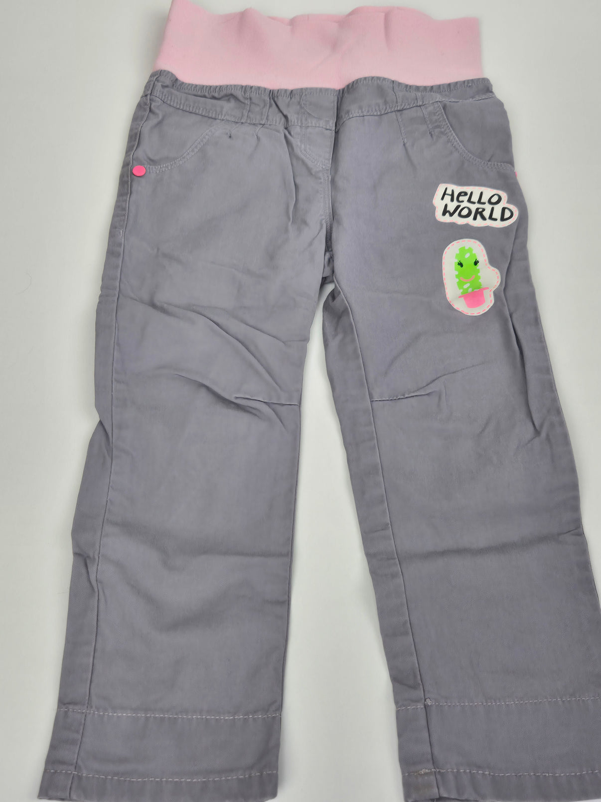 Pohodlné dívčí kalhoty Dopodopo ve velikosti 92 v šedofialovém odstínu s růžovým nápletem v pase. Kalhoty mají dvě přední kapsy a hravý potisk se zelenou zmrzlinkou a nápisem Hello World, který dodává veselý nádech. Díky pružnému pasu se snadno oblékají a krásně drží. Ideální na každodenní nošení, do školky i na venkovní hry.