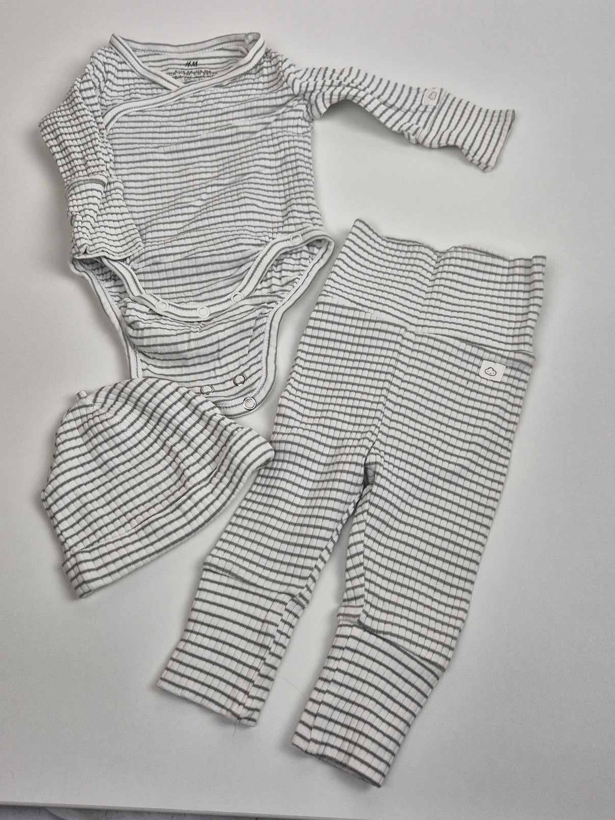 Jemný tříkouskový set v neutrální kombinaci bílé a světle šedé s drobným proužkem je ideální výbavou pro novorozence. Body s dlouhým rukávem má praktické překládané zapínání, které usnadní oblékání i přebalování. Legíny s pohodlným pasem a sladěná čepička krásně doplňují celý outfit.