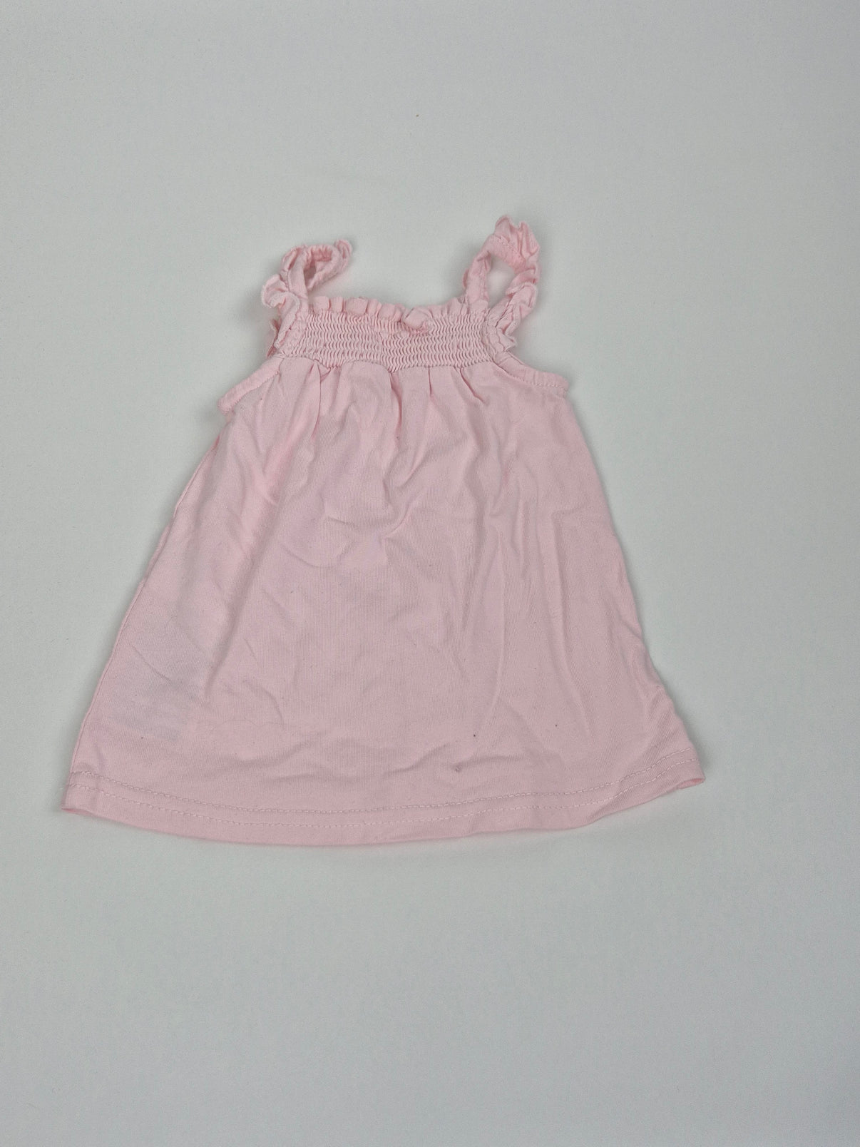 Souprava obsahuje světle růžové tílko s nařasenými ramínky a kraťásky s gumičkou v pase.