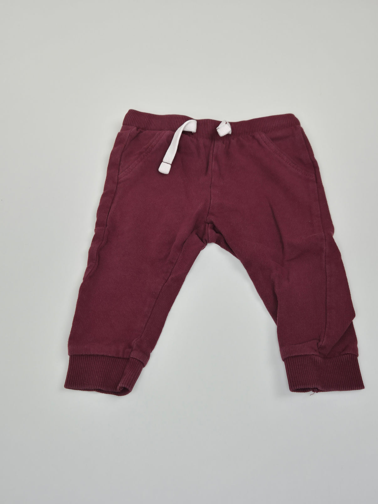 Příjemné tepláčky v hluboké vínové barvě, ideální na každý den do kočárku, do školky i na domácí pohodu. Měkký bavlněný úplet, žebrované náplety na nohavicích a pružný pas na stažení...