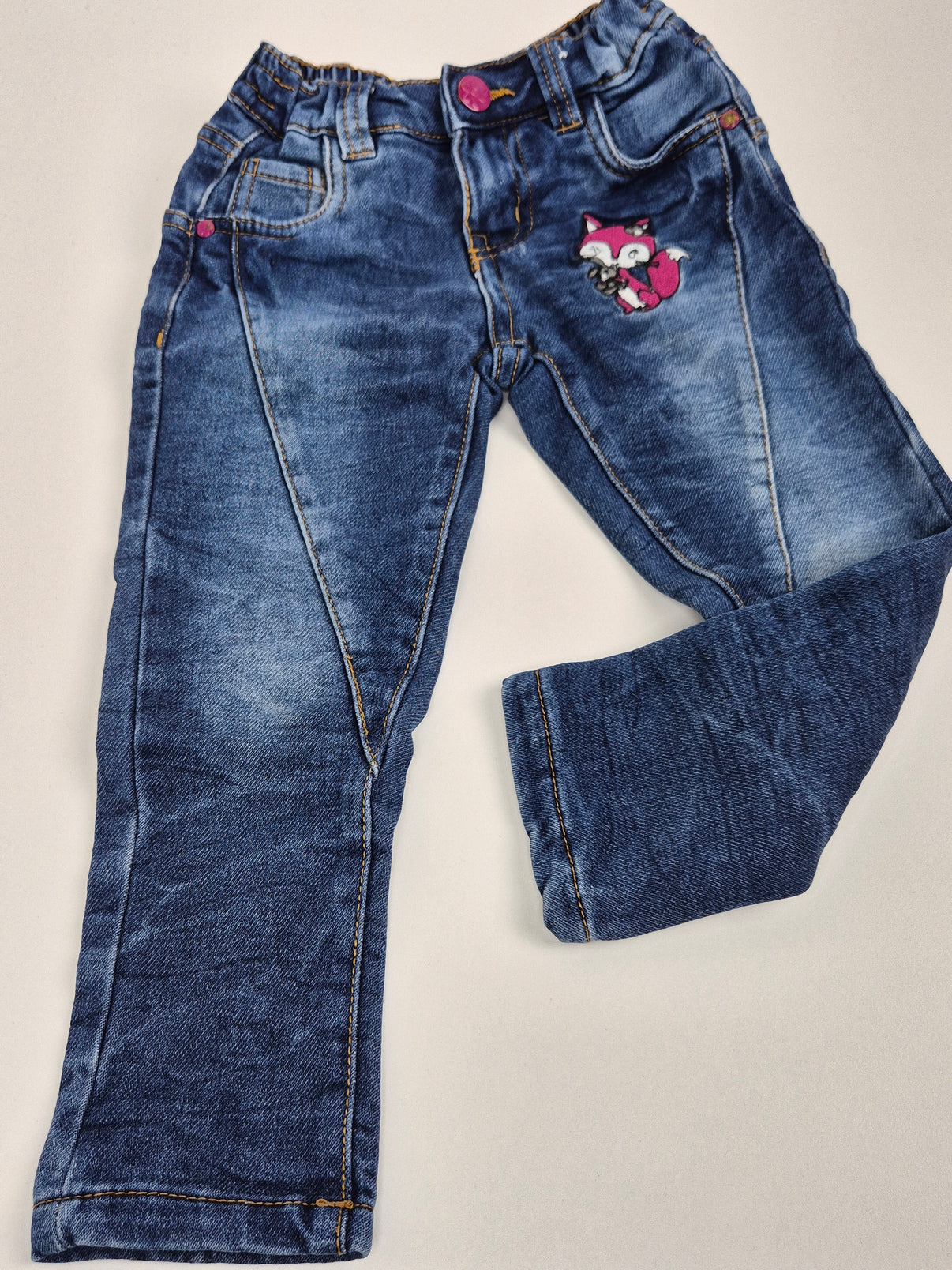 Roztomilé dívčí džíny Kiki&Koko v klasické středně modré denimové barvě, ozdobené výšivkou růžové lištičky na nohavici. Mají pružný pas pro pohodlné oblékání, kontrastní prošití a střih ideální na každý den...