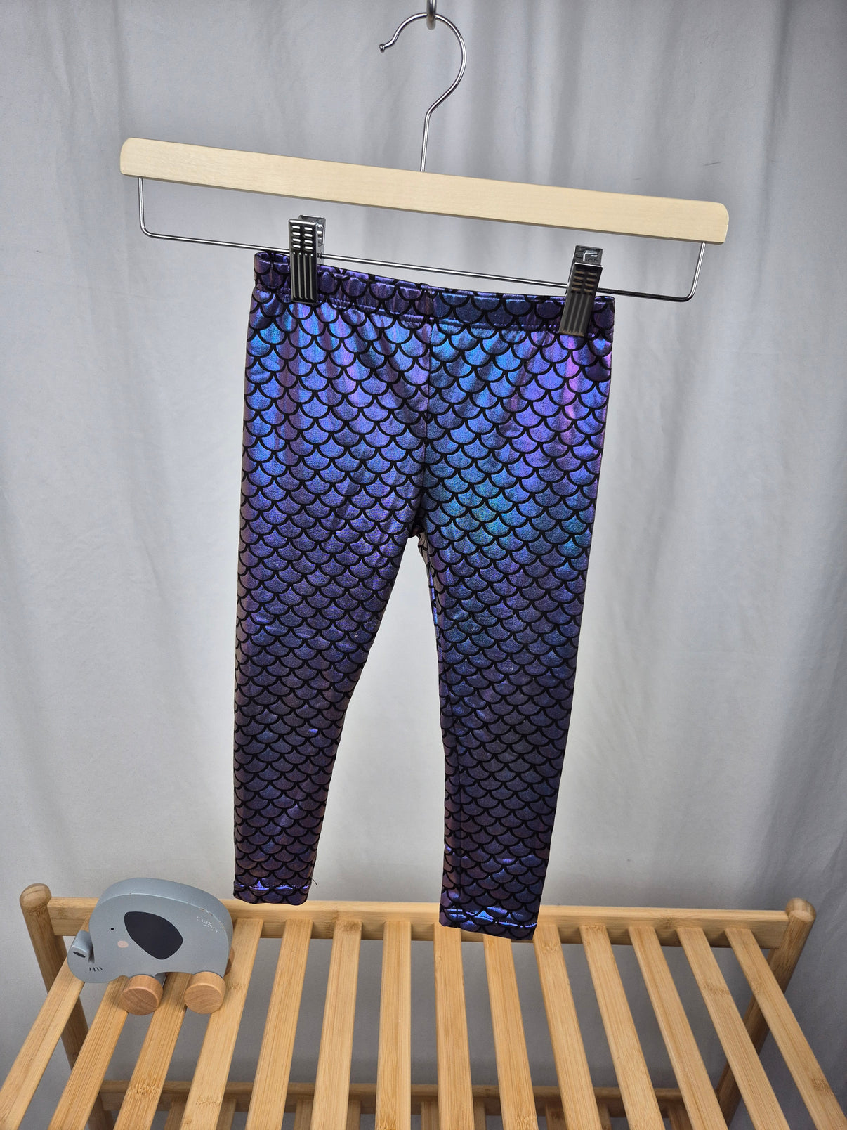 Lesklé dětské legíny Sinsay v kouzelné mořské kombinaci modré, tyrkysové a fialové s potiskem připomínajícím šupinky mořské víly. Pružný materiál se krásně přizpůsobí postavě a zajistí pohodlí při pohybu. Perfektní volba pro malé parádnice – na doma, oslavu nebo do školky.