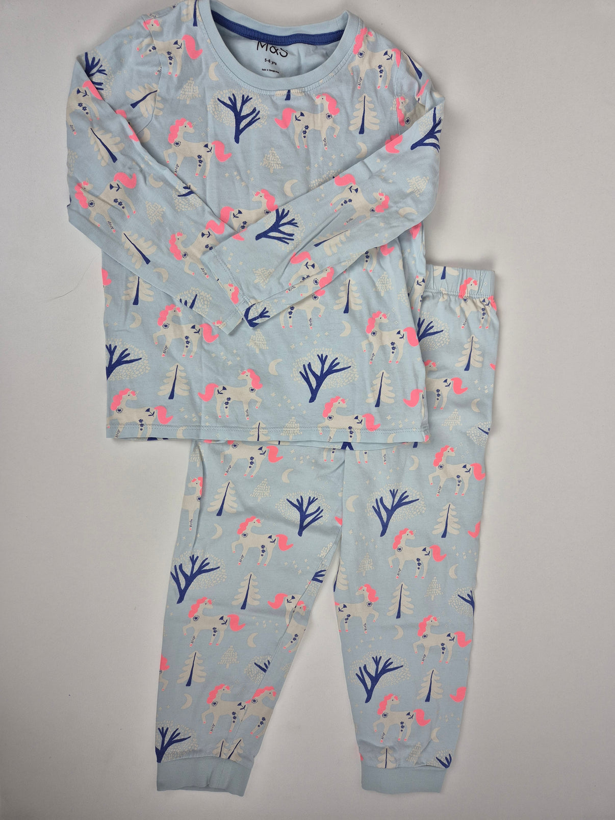 Roztomilé dvoudílné pyžamo značky Marks & Spencer ve velikosti 116. Světle modrý základ zdobí celoplošný potisk jednorožců s růžovou hřívou, doplněný motivy stromků, měsíců a hvězdiček v bílých a tmavě...