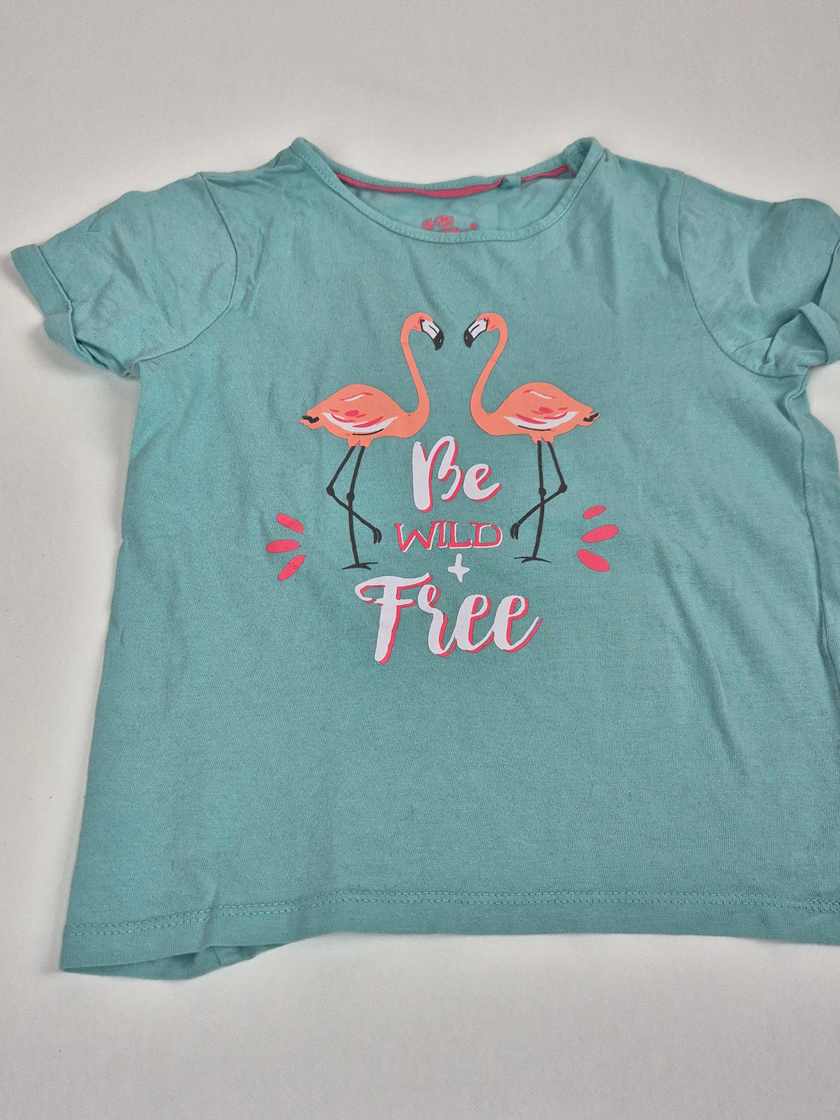 Toto tričko značky Lupilu ve velikosti 98/104 je tyrkysové s potiskem dvou plameňáků a nápisem „Be wild & free“. Je lehké, bavlněné, ideální na léto nebo jako domácí oblečení. 🦩