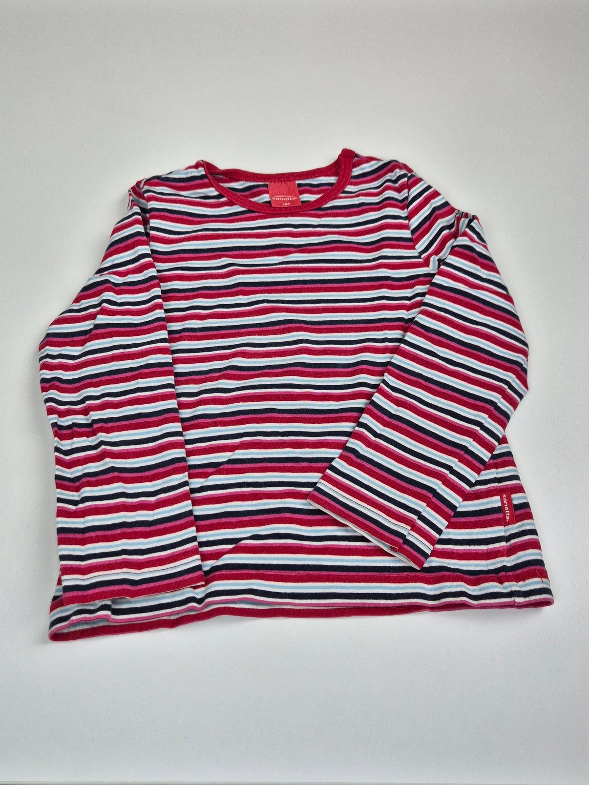 Pruhované tričko s dlouhým rukávem od značky Sanetta, která je známá kvalitními a pohodlnými dětskými kousky. Kombinace malinově červené, námořnické modré a bílé vytváří hravý, ale zároveň nadčasový pruhovaný vzor. Tričko je z příjemného bavlněného materiálu, ideální na každodenní nošení do školky, na hřiště i domů.