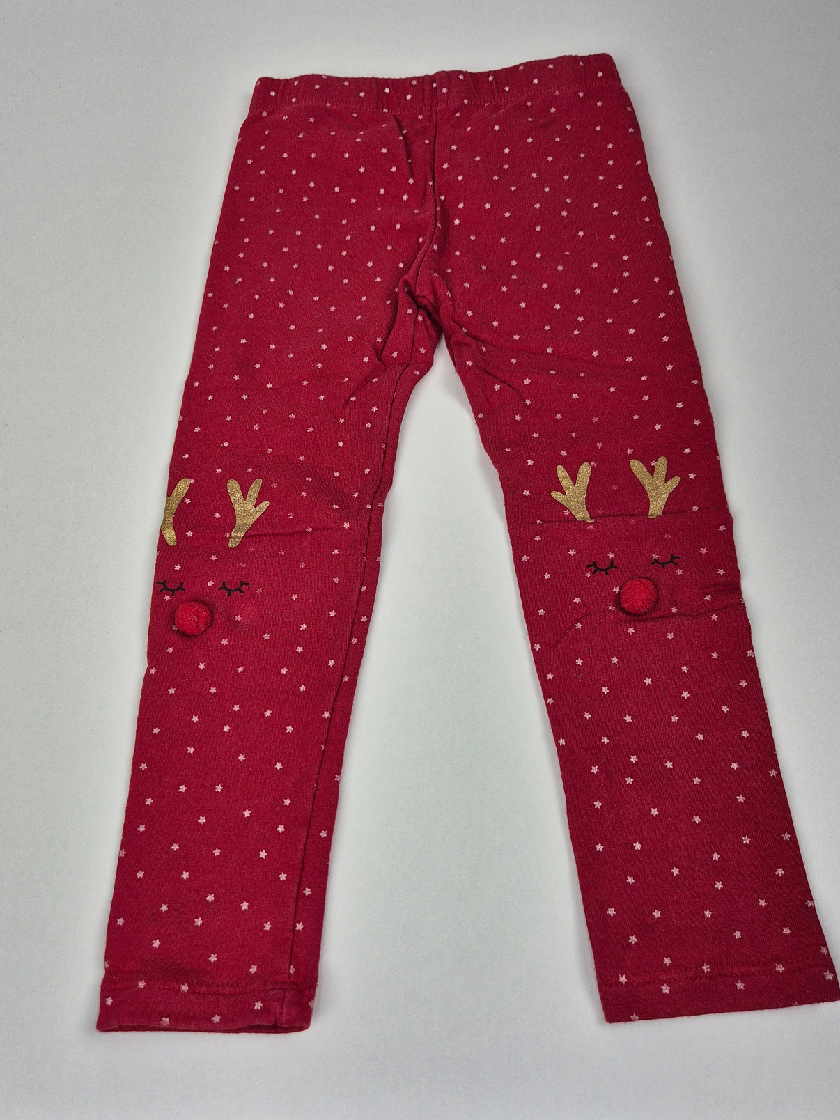 Červené dívčí legíny s jemným potiskem hvězdiček a veselým vánočním motivem sobů – s vyšívanými parůžky a měkkým bambulkám místo nosu. Pohodlný pružný pas zajišťuje snadné oblékání i pohodlí při nošení. Skvělé do školky, na vánoční besídku i na domácí sváteční pohodu.