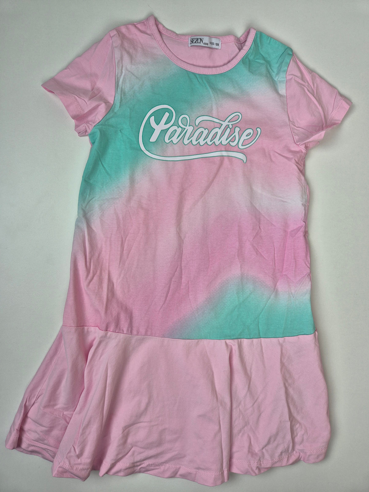 Letní šaty Sezon v krásném růžovo–mint ombré provedení přinášejí svěží, prázdninový vzhled. Přední část zdobí výrazný bílý nápis „Paradise“, který k šatům perfektně sedí. Lehký bavlněný materiál, krátké rukávy a volánová sukně jsou ideální na teplé dny – do školy, parku i na výlety. Určeno pro holčičku.