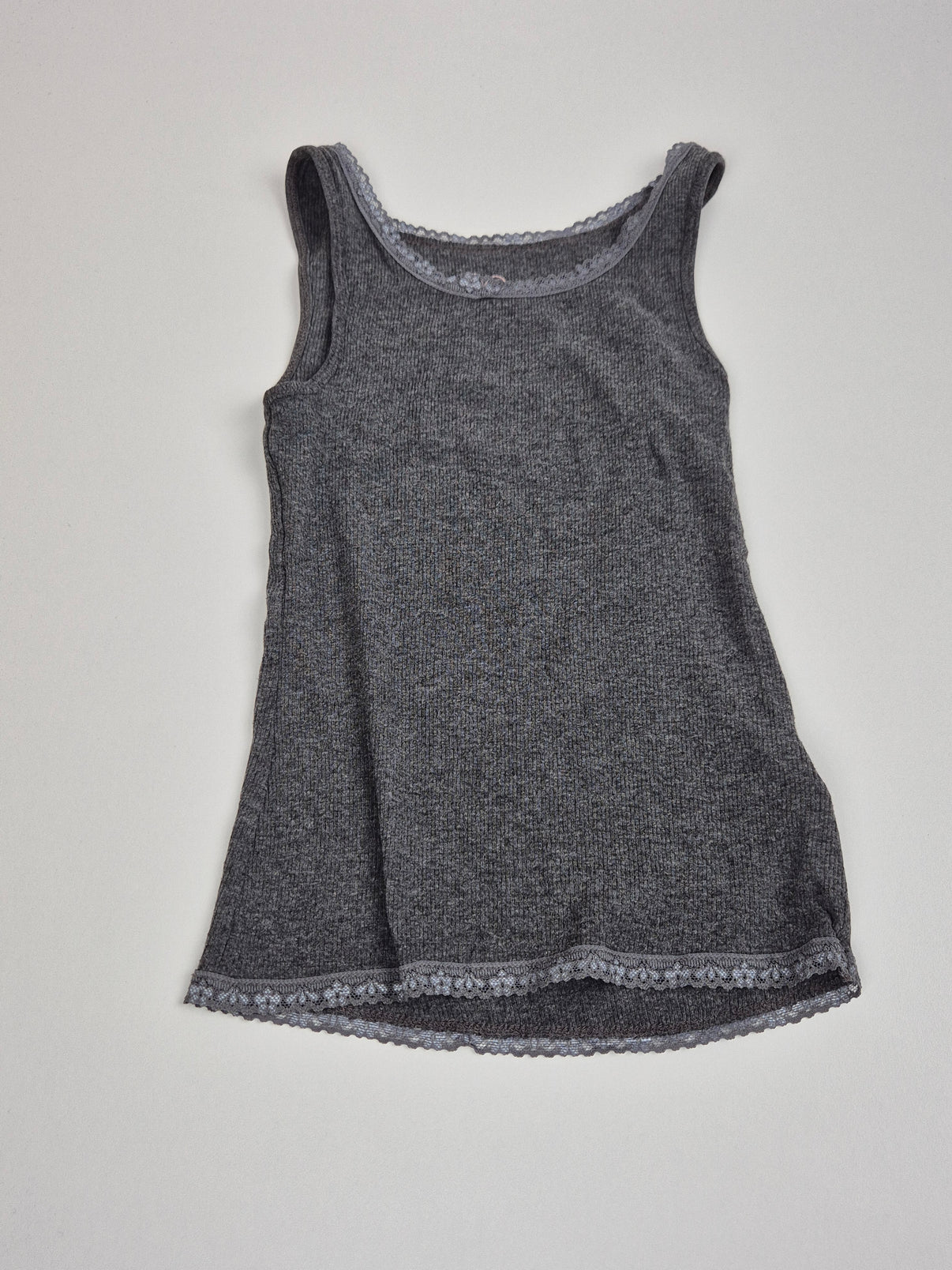 Pohodlné žebrované tílko v tmavě šedém melírovaném odstínu, který je praktický a snadno kombinovatelný. Jemná šedá krajka kolem výstřihu a na spodním lemu dodává kousku hezký, nenápadně holčičí detail.