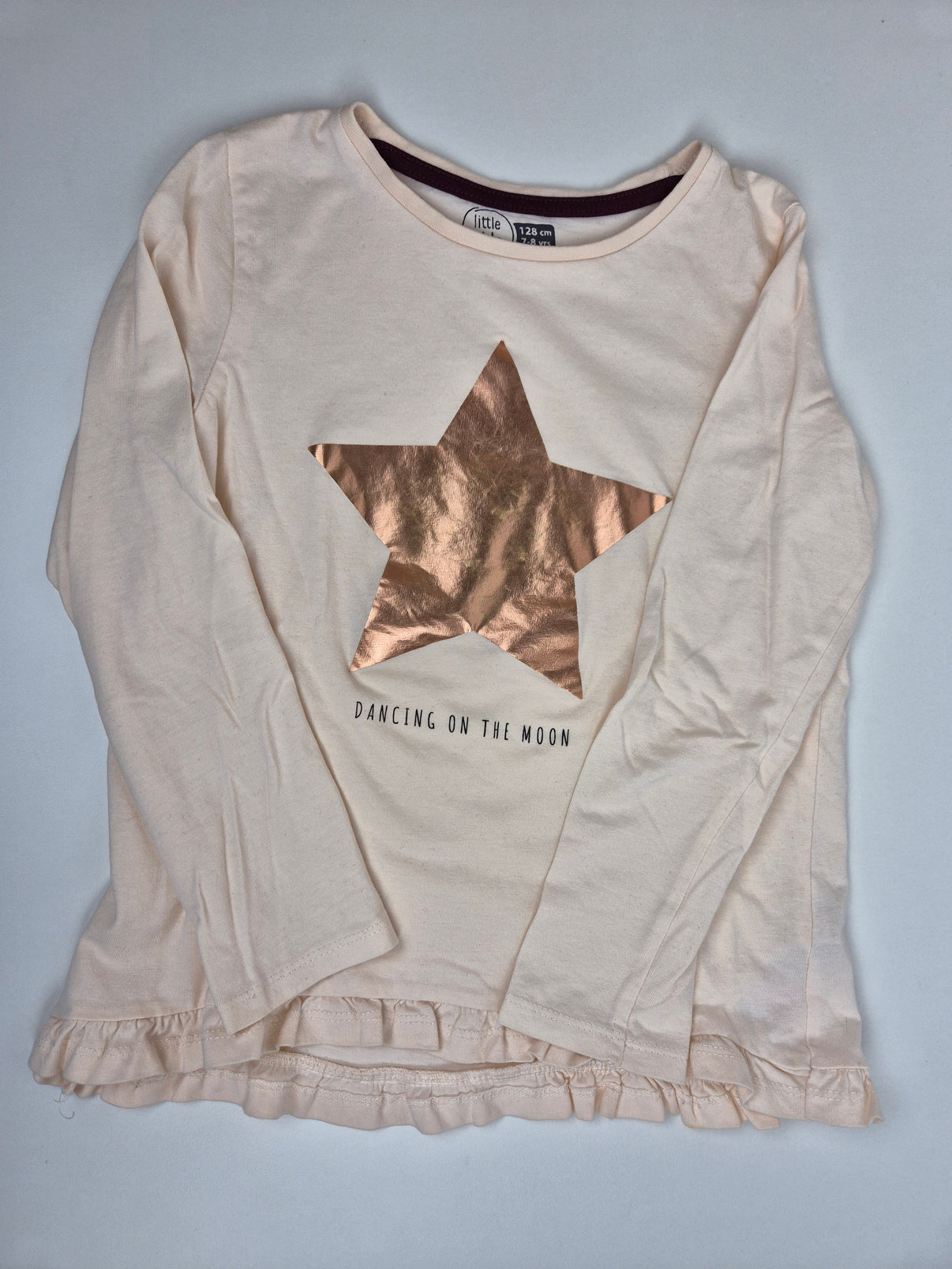 Dívčí tričko s dlouhým rukávem v jemném pudrově béžovém odstínu působí elegantně a přitom hravě. Dominantou je velká metalická hvězda v měděno-růžovém tónu, která tričku dodává lehce slavnostní nádech. Drobné řasení a volánek na spodním lemu krásně doplňují celkový vzhled a přidávají holčičí jemnost.