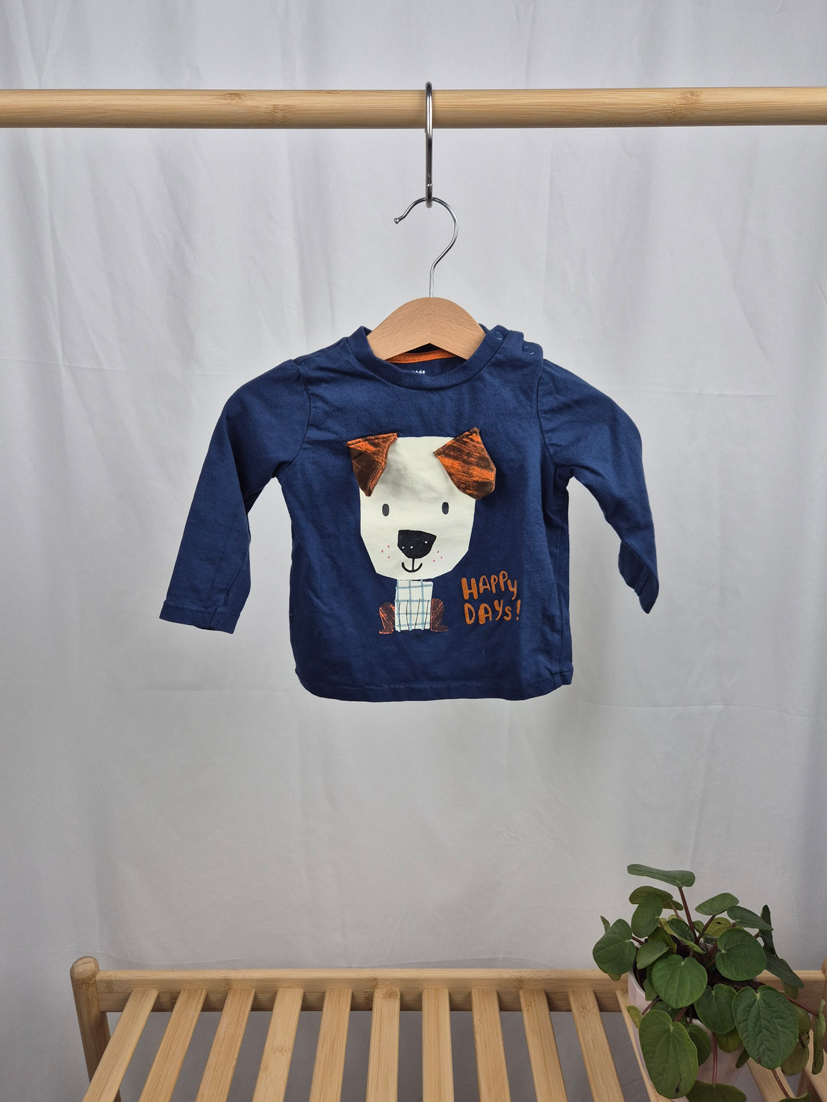 Tmavě modré triko s dlouhým rukávem od značky F&F ve velikosti 74. Na přední straně je roztomilý motiv pejska s 3D oušky a nápisem „Happy Days!“. Pohodlný střih a příjemný materiál zajistí maximální komfort při celodenním nošení. Praktické zapínání na rameni usnadňuje oblékání. Skvělý kousek pro každodenní dobrodružství malých objevitelů.