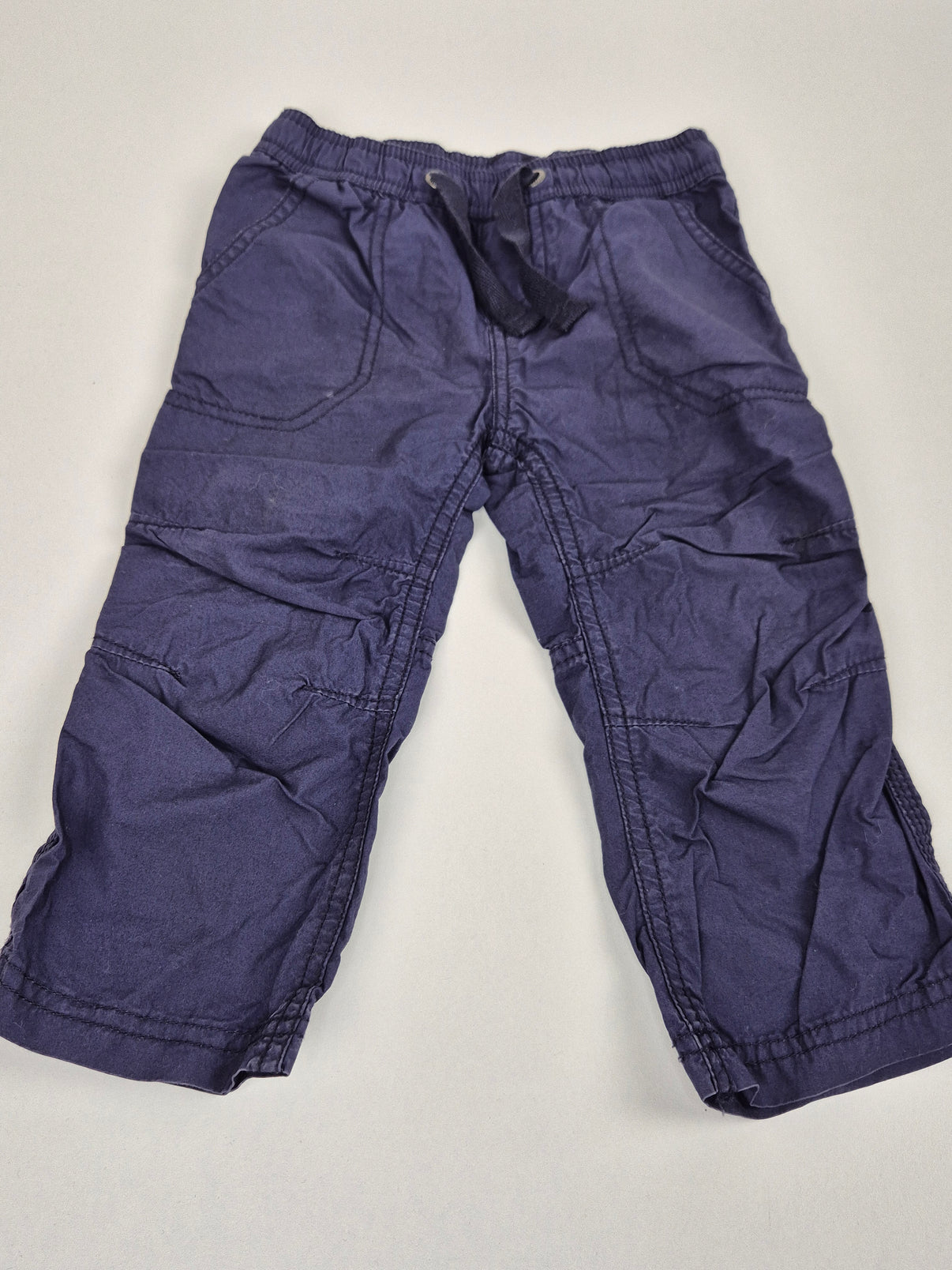 Tmavě modré chlapecké kalhoty značky Lupilu ve velikosti 86 jsou ideální na každodenní nošení i hraní venku. Díky pohodlnému pasu na gumu se šňůrkou a volnějšímu střihu se dětem skvěle nosí a neomezují je v pohybu. Praktické kapsy a odolnější švy na kolenou se postarají o větší výdrž při běhání i lezení.
