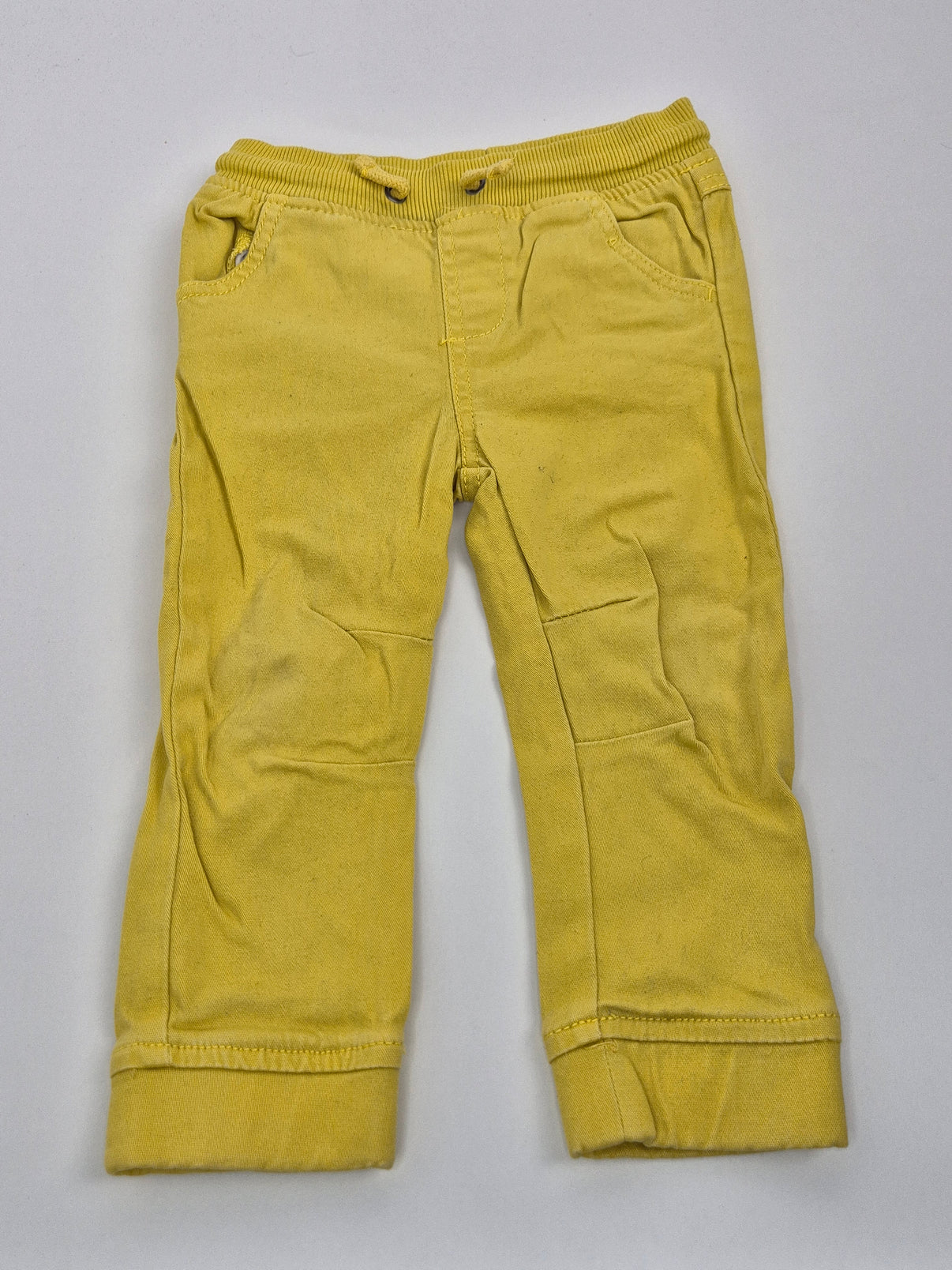 Veselé žluté kalhoty Pepco v pohodlném střihu, ideální na každodenní nošení. Měkký materiál a pružný pas se stahovací šňůrkou zajišťují, že kalhoty krásně sedí a nikde netlačí. Praktické kapsy a mírně ohrnuté nohavice dodávají celému kousku ležérní, hravý vzhled. Skvělé pro kluka i holčičku – do školky, ven i na doma.