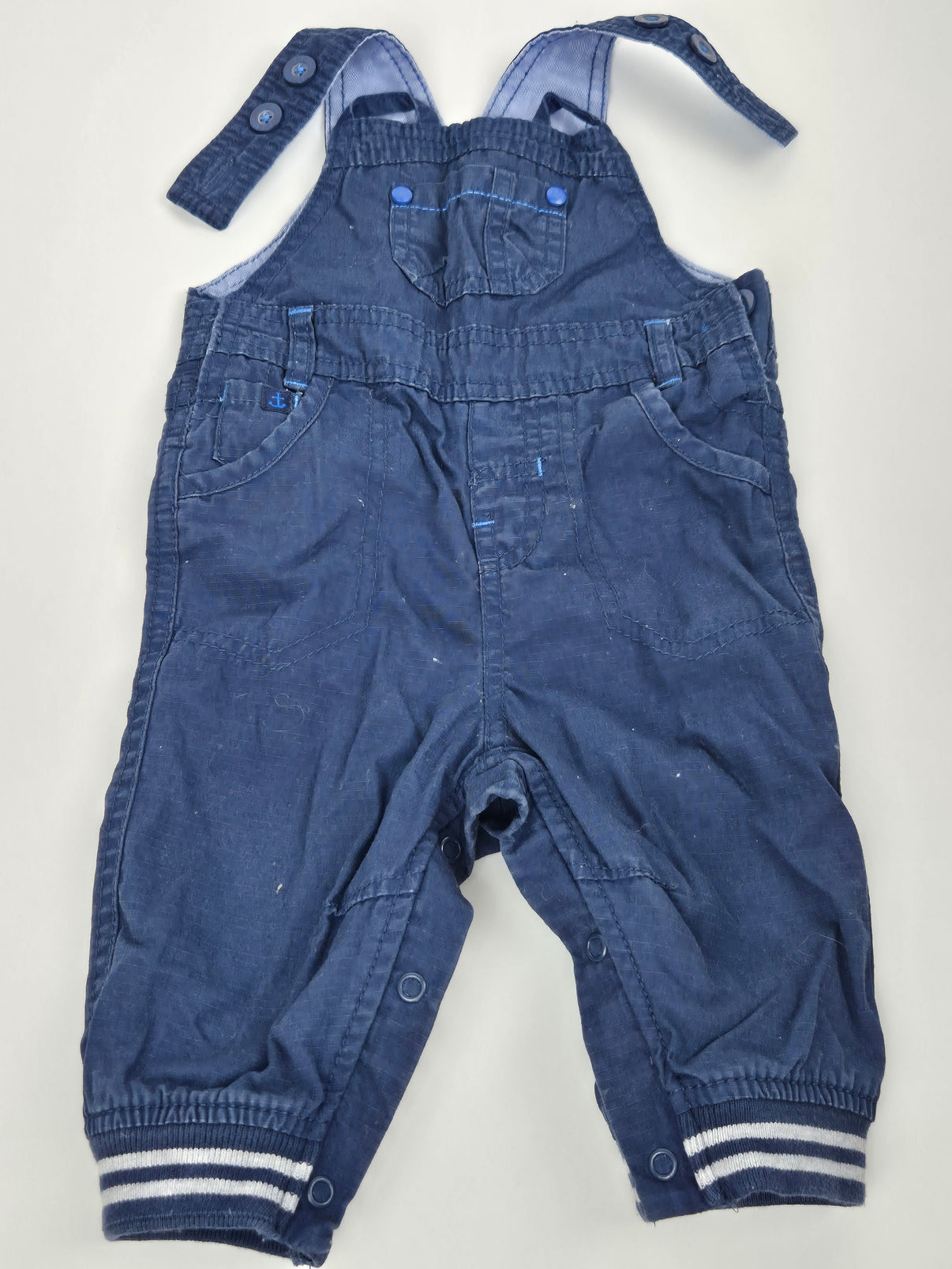 ohodlné a stylové laclové kalhoty Marks & Spencer ve velikosti 69 v tmavě modrém provedení s kontrastním modrým prošíváním. Praktické detaily jako zapínání na ramínkách a mezi nožičkami pro snadné přebalování, pružné náplety s proužkem na nohavicích a funkční kapsy dělají z tohoto kousku ideální volbu pro malé chlapečky na každý den. Skvěle se hodí na procházky, hraní i do kočárku.