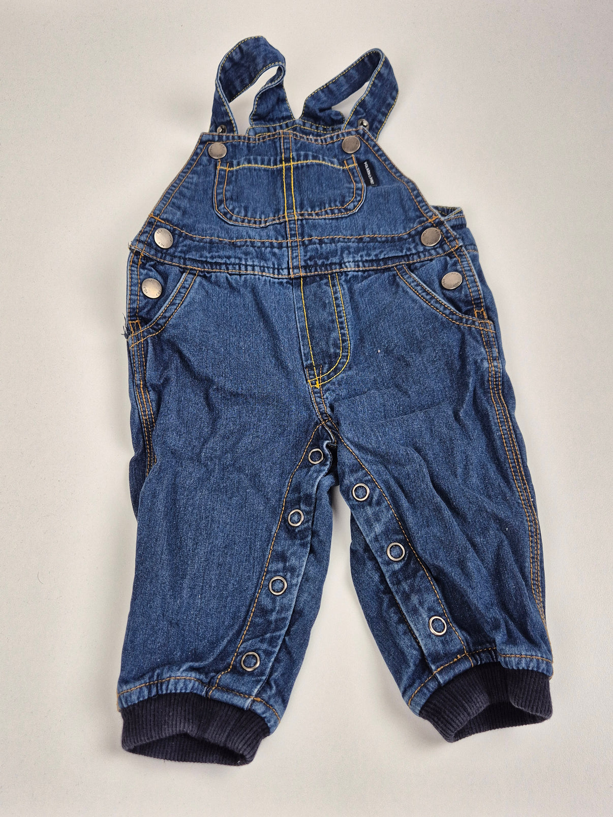 Džínové laclové kalhoty značky Polarn O. Pyret, velikost 62, v klasickém modrém denimu se žlutým kontrastním prošíváním. Praktické zapínání na cvočky po stranách a mezi nohavicemi usnadňuje přebalování. Spodní lemy jsou zakončené náplety pro větší pohodlí. Odolný a stylový kousek, ideální pro malé dobrodruhy.
