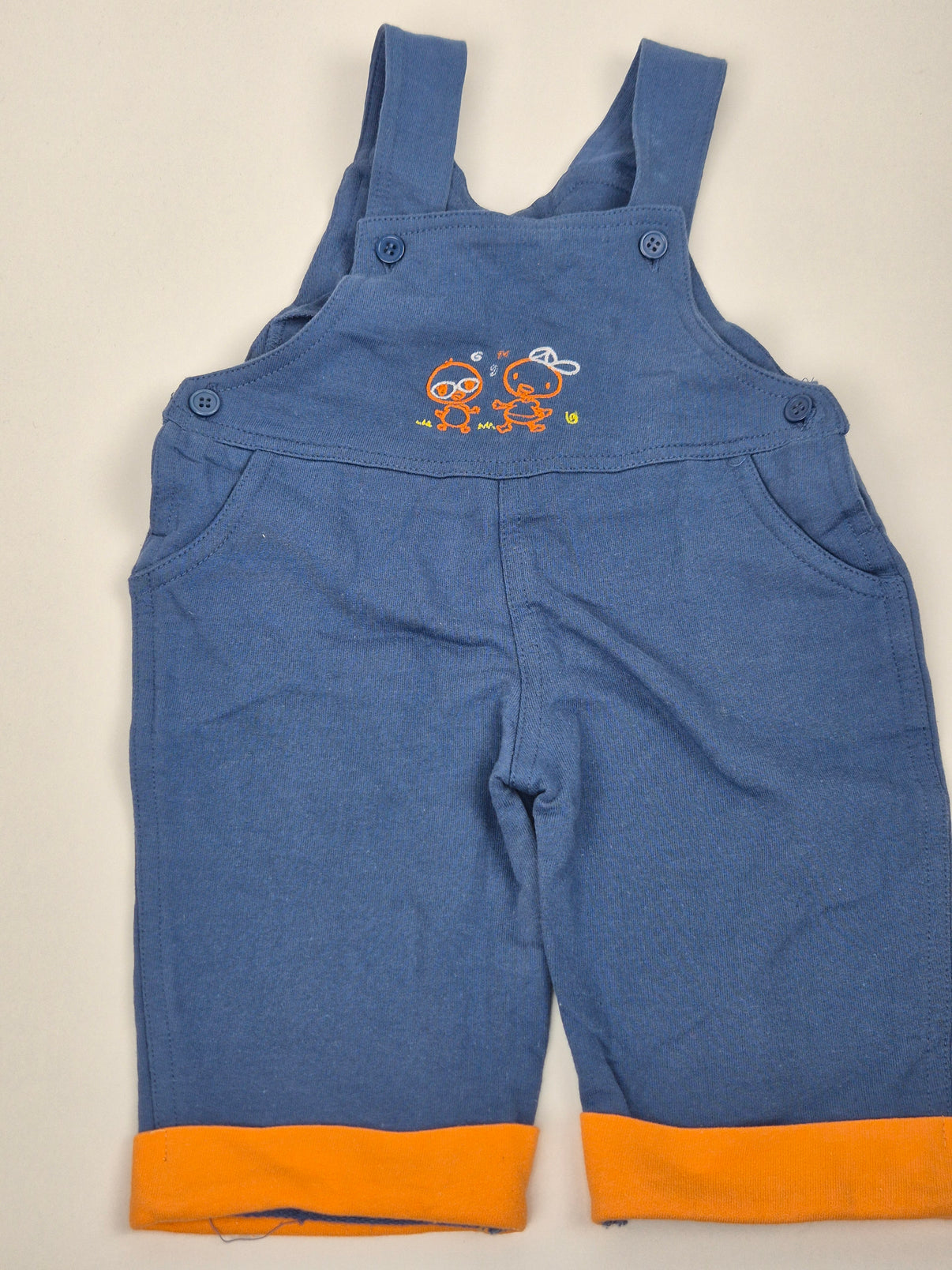 Pohodlné dětské laclové tepláčky ve velikosti 68 v tlumeném modrém odstínu s výrazným oranžovým zakončením nohavic. Na hrudní části je roztomilá výšivka dvou veselých postaviček, která dodává outfitu hravý nádech....