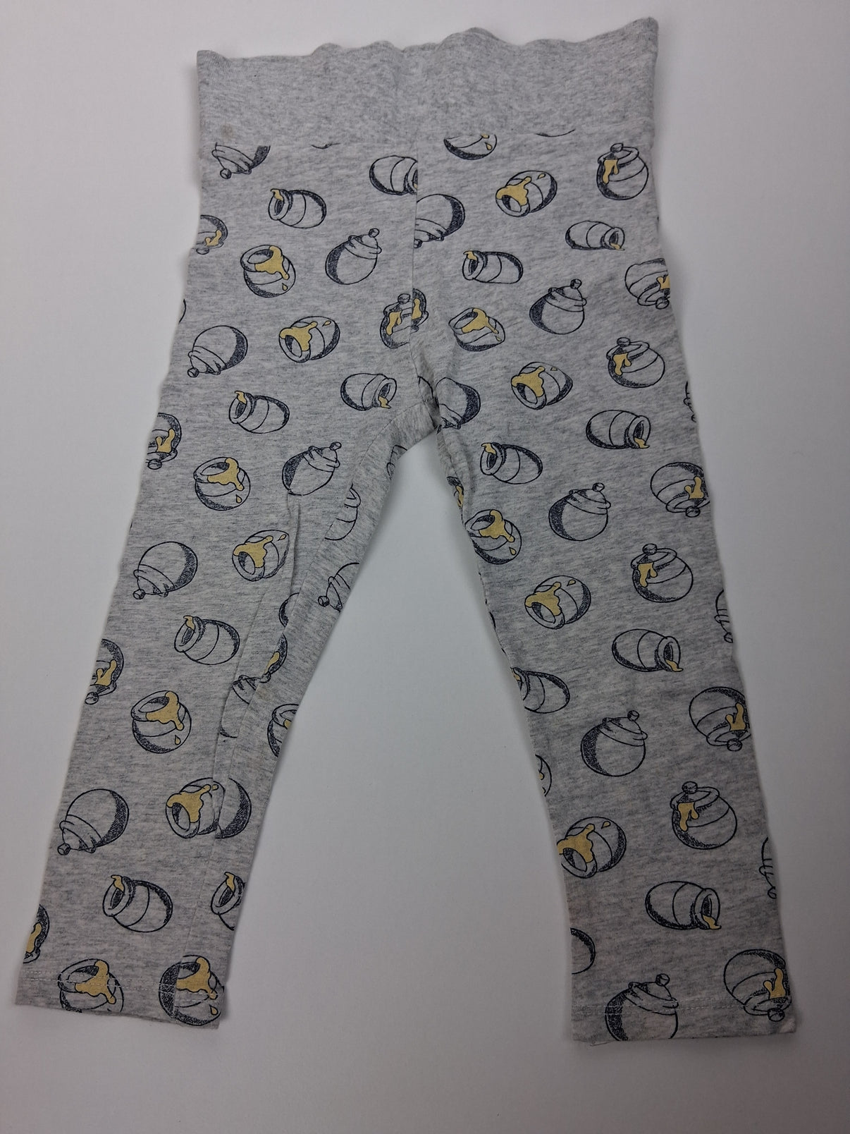 Pohodlné světle šedé legíny ve velikosti 86/92 zaujmou veselým potiskem medových hrnečků s vytékajícím medem – motivem inspirovaným Medvídkem Pú. Díky měkkému pasu bez gumičky jsou velmi pohodlné i pro menší děti a nijak netlačí.