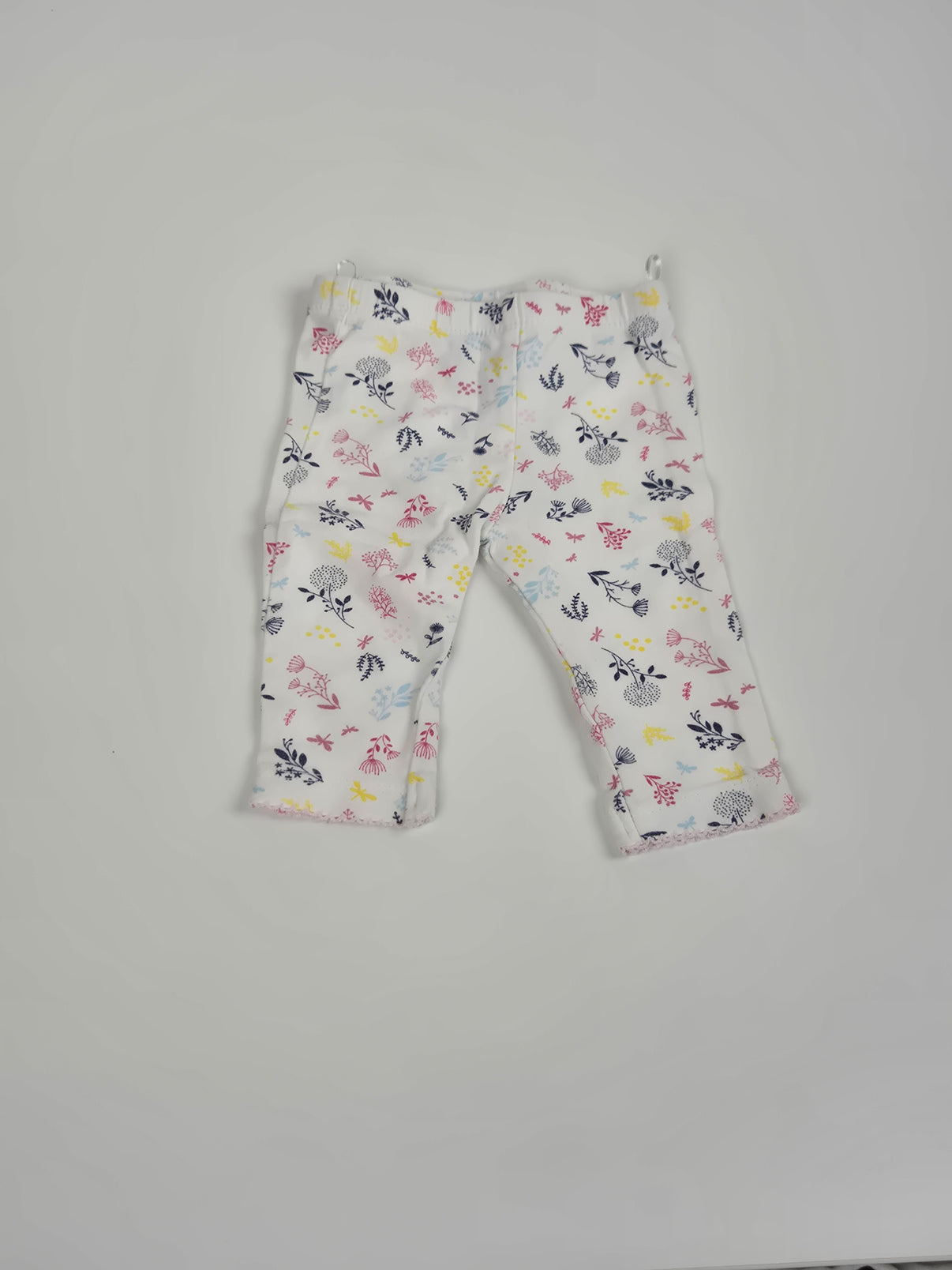 Bílé legíny C&A ve velikosti 62 s barevným celoplošným potiskem květin a drobných větviček v růžových, žlutých a modrých tónech. Elastický pas zajistí pohodlí při nošení, materiál je měkký a příjemný pro miminka.