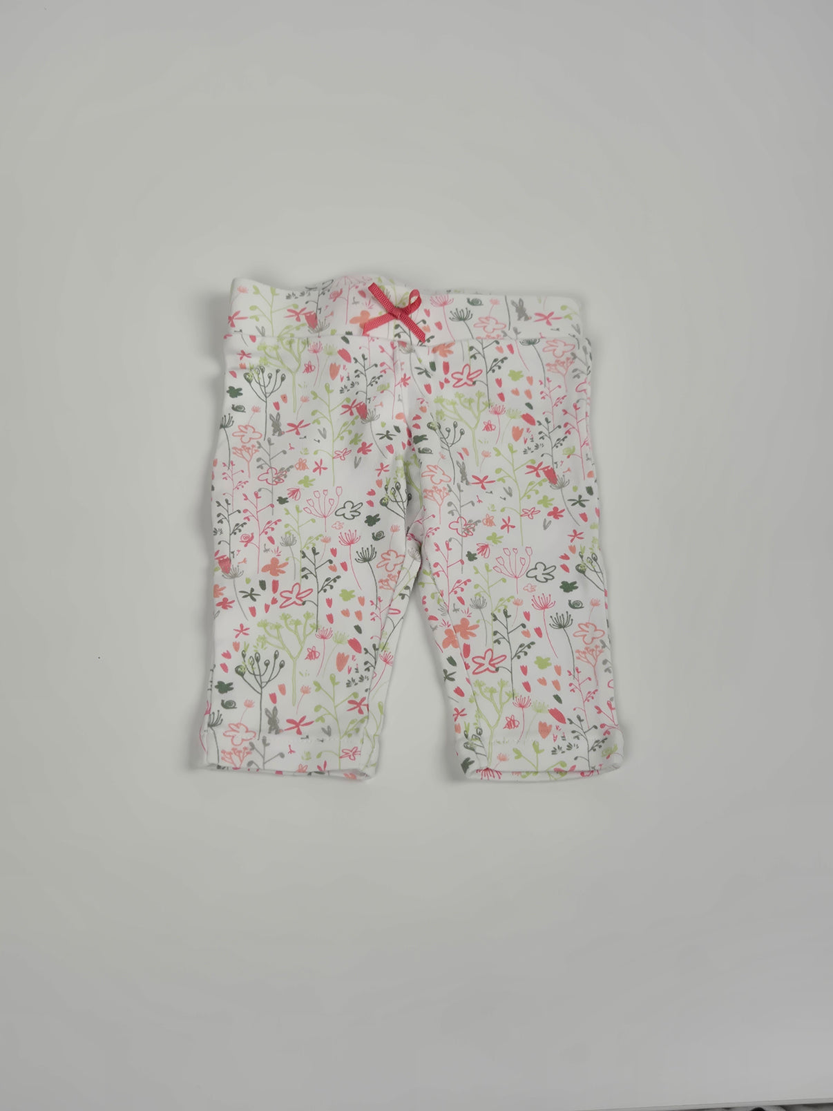 Bílé legíny F&F ve velikosti 62 s jemným celoplošným květinovým vzorem v růžových a zelených tónech. Pas je na gumu, vpředu zdobený malou růžovou mašličkou. Díky měkkému bavlněnému materiálu jsou ideální pro pohodlné nošení miminek.