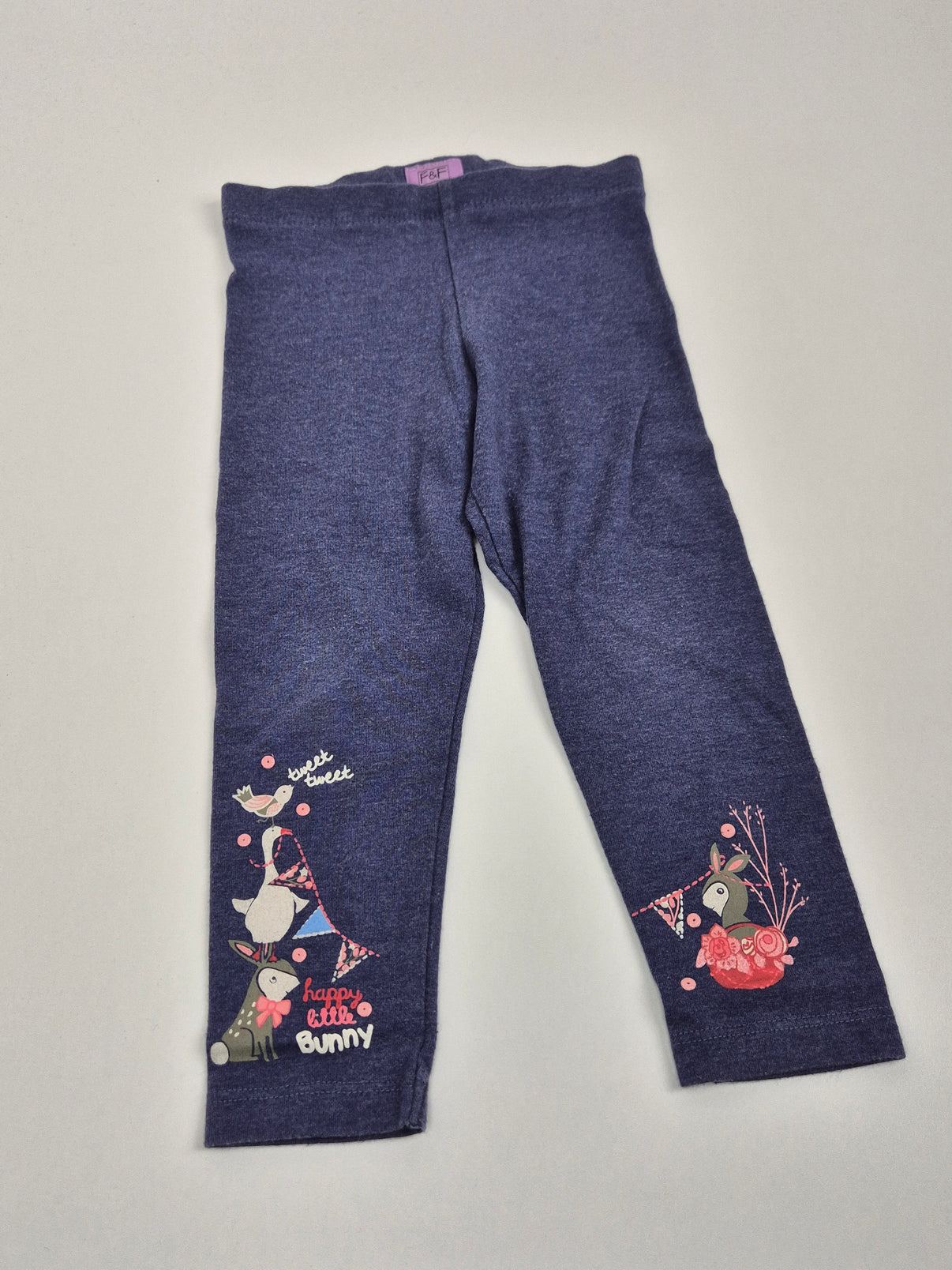 Tmavě modré legíny F&F ve velikosti 92, ideální pro malou slečnu na každodenní nošení. Veselé potisky zvířátek – králíčků, ptáčků a kytiček – dodávají legínám hravý a roztomilý vzhled. Příjemný...