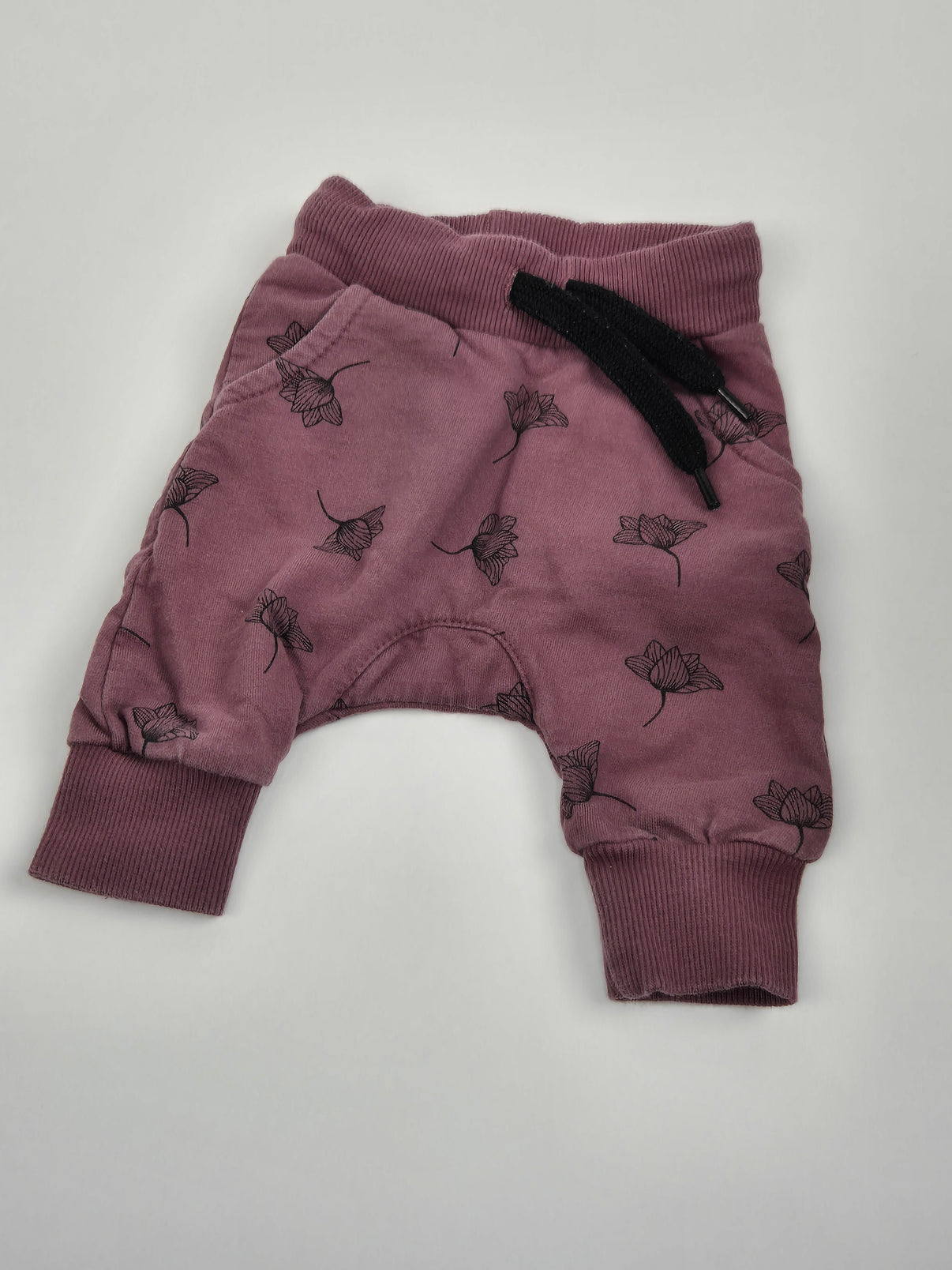Stylové tepláčky Pinokio s nižším sedem v tlumeném fialovorůžovém odstínu jsou ideální pro pohodlné každodenní nošení. Jemný květinový motiv dodává oblečení něžný nádech a širší žebrované lemy v pase i na nohavicích zajistí, že tepláčky dobře drží na místě. Černá šňůrka v pase je nejen praktickým, ale i výrazným designovým prvkem. Skvělé pro holčičky na doma, do kočárku i na výlety.