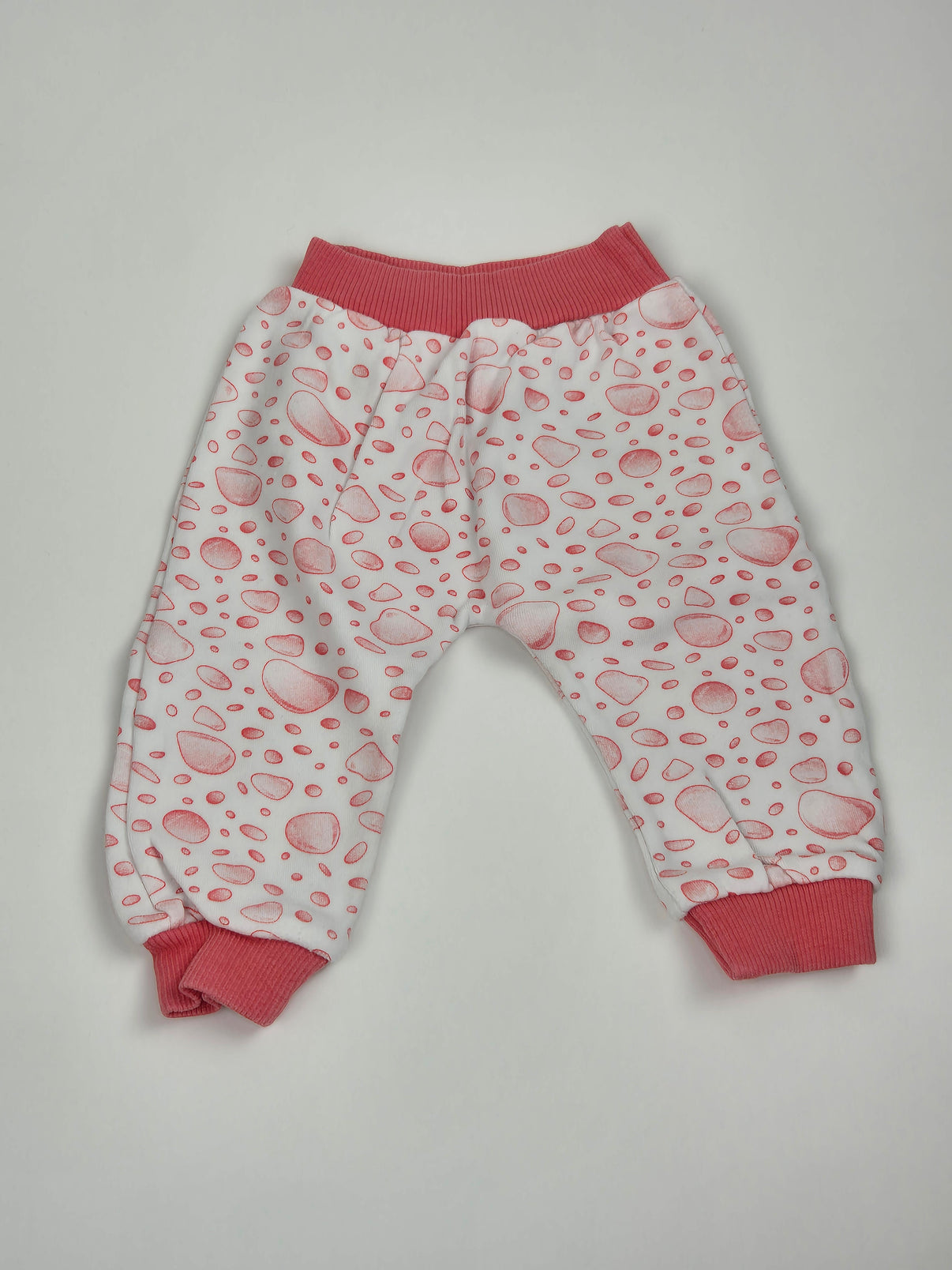 Pohodlné kojenecké tepláčky ve velikosti 62 zaujmou veselým potiskem růžových bublin na bílém podkladu. Měkký úplet a široké žebrované lemy v pase i na nohavicích zajišťují maximální pohodlí a volnost pohybu, ať už miminko leží, pase koníky nebo se začíná plazit.