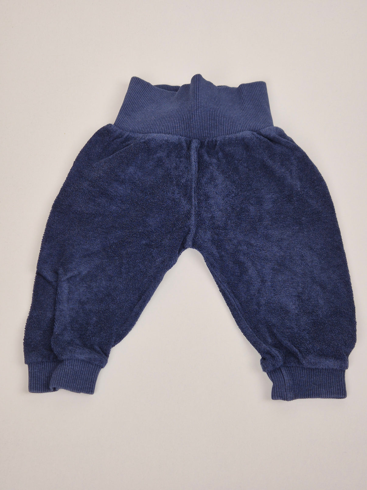Hebké tepláčky značky Alana ve velikosti 62 jsou ušité z měkoučkého froté materiálu v tmavě modrém odstínu, který krásně hřeje a je příjemný na dotek. Vysoký žebrovaný pas i pružné lemy u kotníků zajišťují pohodlné nošení bez sklouzávání.