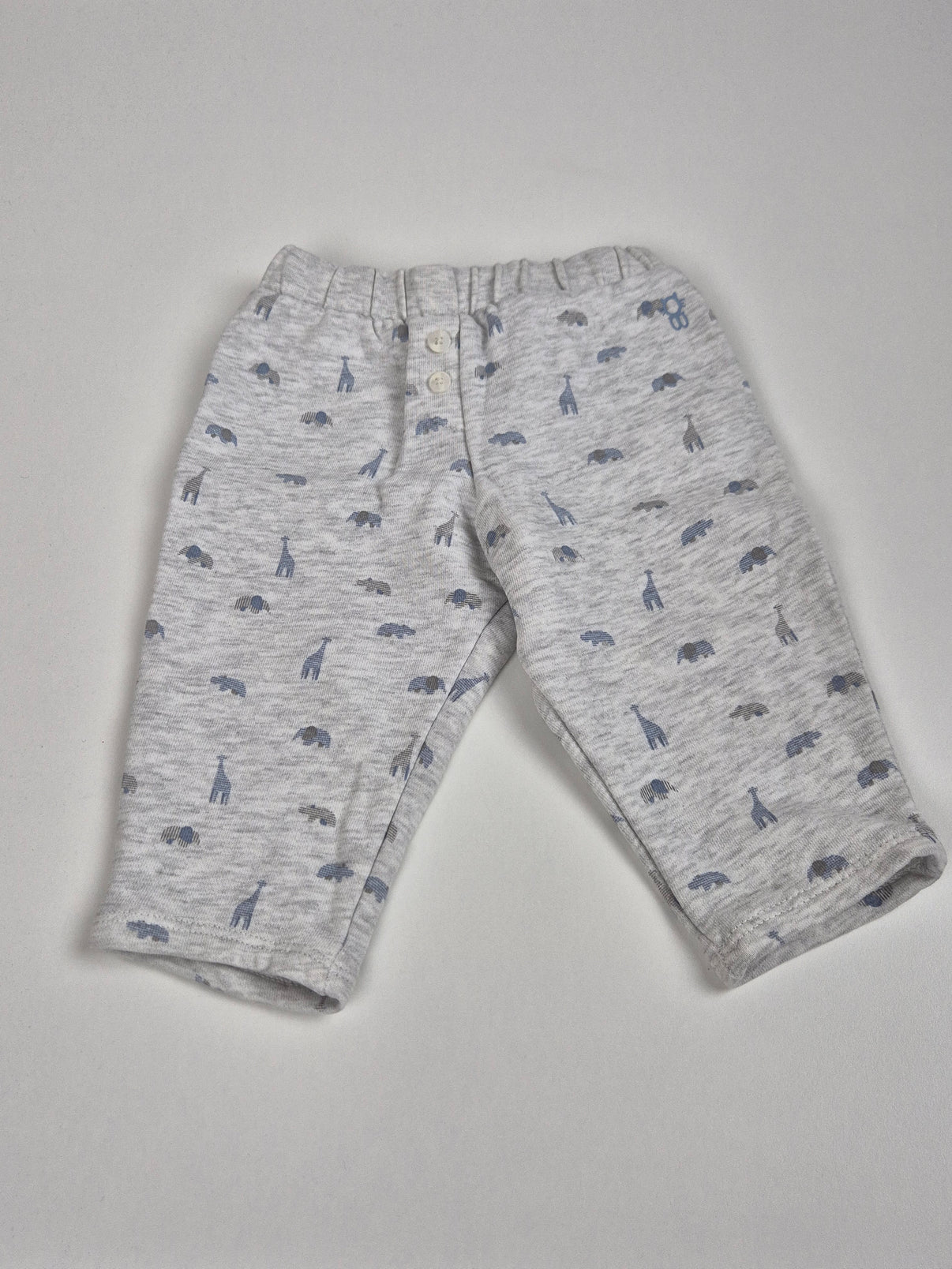 Měkké tepláky značky Obaibi ve velikosti 68, vhodné pro kluky. V světle šedé barvě s jemným celoplošným potiskem modrých zvířátek (žirafy, hroši a sloni). V pase mají pružnou gumu a zdobí je tři malé knoflíčky, což usnadňuje oblékání a zároveň dodává hezký detail. Díky příjemnému materiálu jsou ideální na každodenní nošení doma i venku.