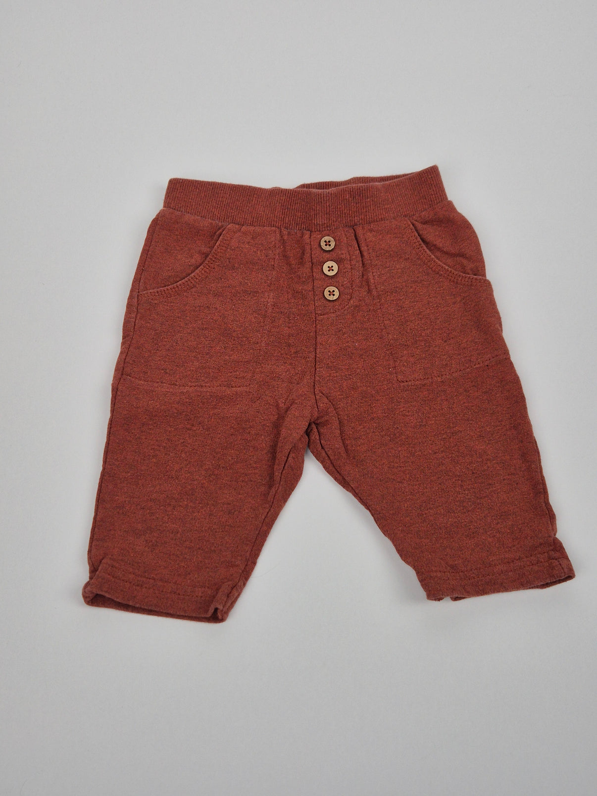 Pohodlné tepláčky značky Topomini ve velikosti 62 v hřejivém cihlově hnědém odstínu. Měkký bavlněný materiál je ideální pro citlivou dětskou pokožku a díky pružnému pasu skvěle padnou bez nepříjemného tlačení. Stylové dřevěné knoflíčky na přední části dodávají kalhotám šmrnc a dvě kapsy zvyšují praktičnost. Skvělý unisex kousek na běžné nošení doma i ven.