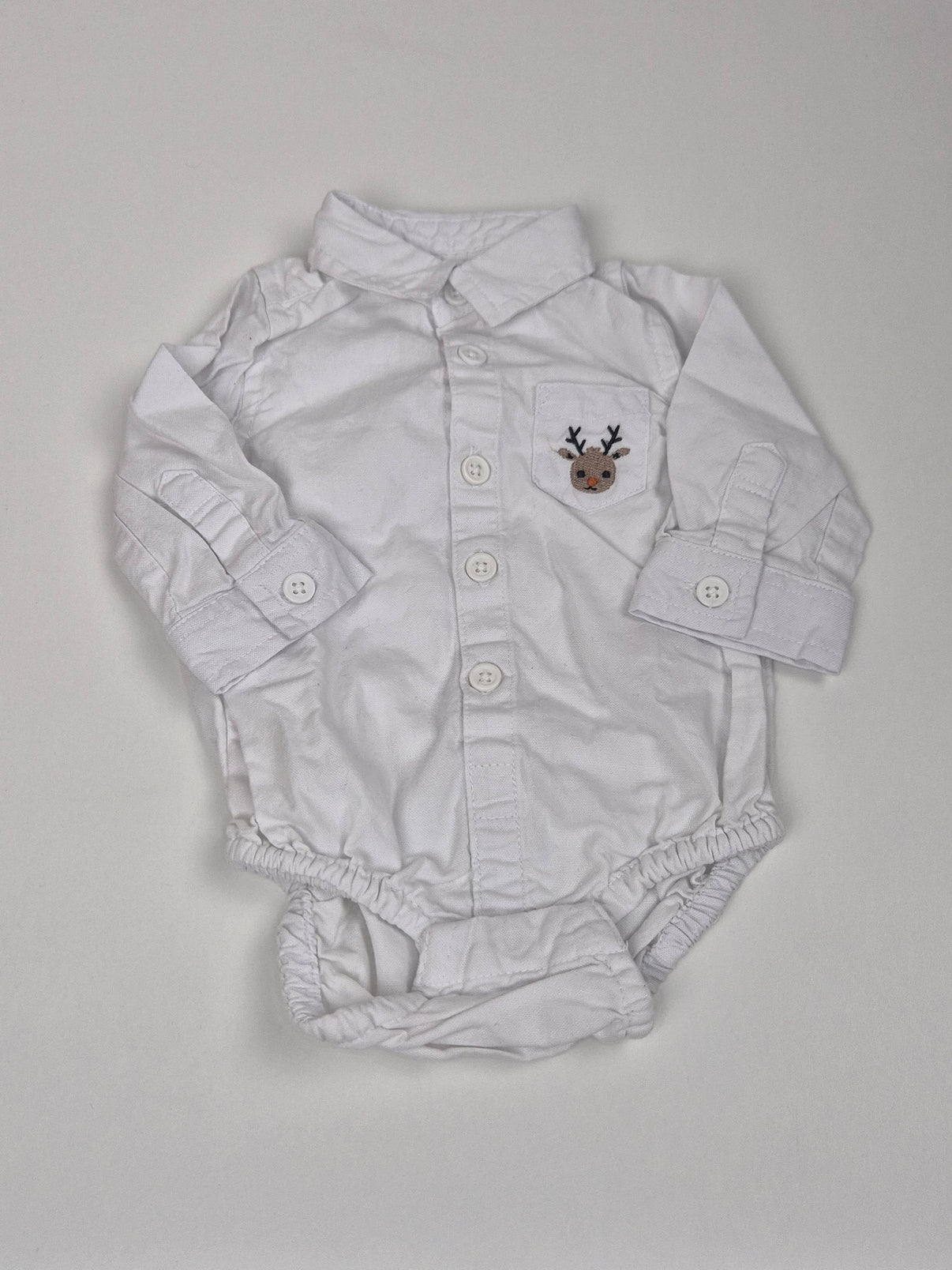 Bílé košilové body značky Pepco ve velikosti 62. Elegantní střih s límečkem, knoflíčky a kapsičkou na prsou, kterou zdobí výšivka roztomilého sobíka. Dlouhý rukáv a zapínání na patentky mezi nožičkami zajistí pohodlné nošení. Ideální vánoční outfit pro malé chlapečky. ❄️🦌👔