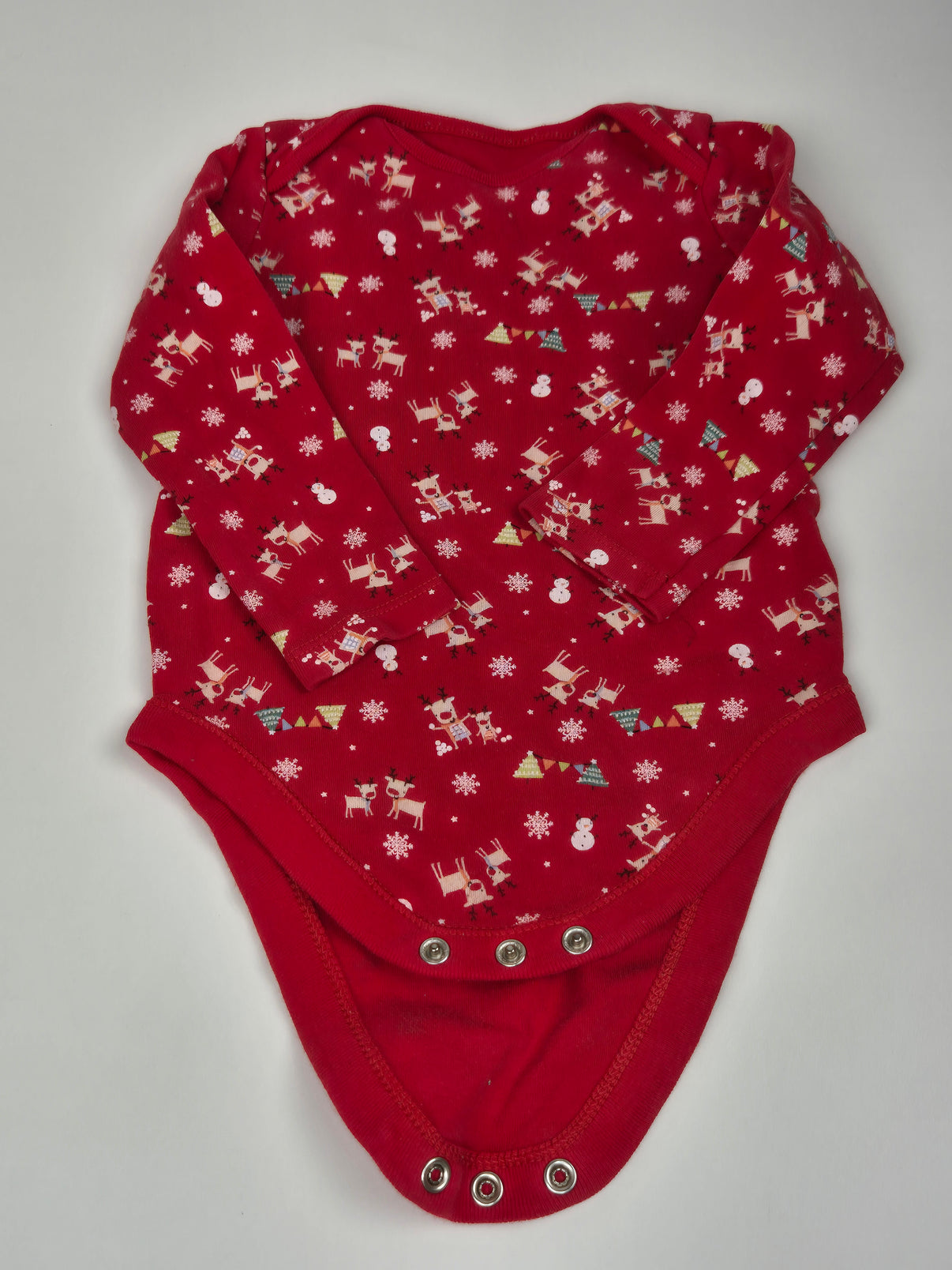 Červené vánoční body značky F&F ve velikosti 80. Dlouhý rukáv a zapínání na patentky mezi nožičkami zajistí pohodlné oblékání. Vzor se sněhuláky, soby, stromečky a vločkami navodí krásnou sváteční atmosféru. Vhodné pro holčičky i chlapečky na vánoční období. 🎄❄️🦌
