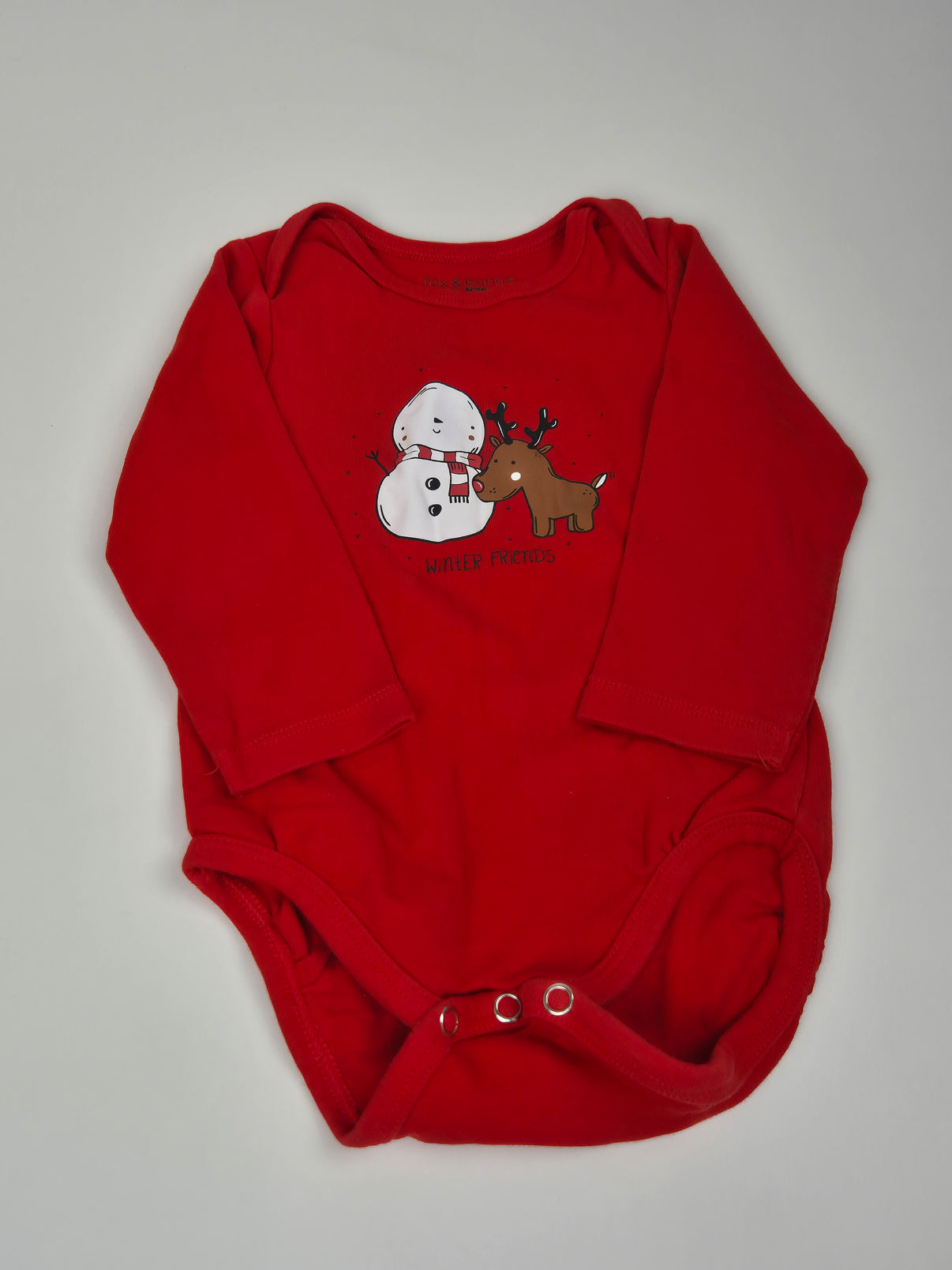 Červené vánoční body značky Sinsay ve velikosti 80. Dlouhý rukáv, zapínání na patentky mezi nožičkami a hravý potisk sněhuláka s roztomilým sobem s nápisem Winter Friends dělají z tohoto kousku...
