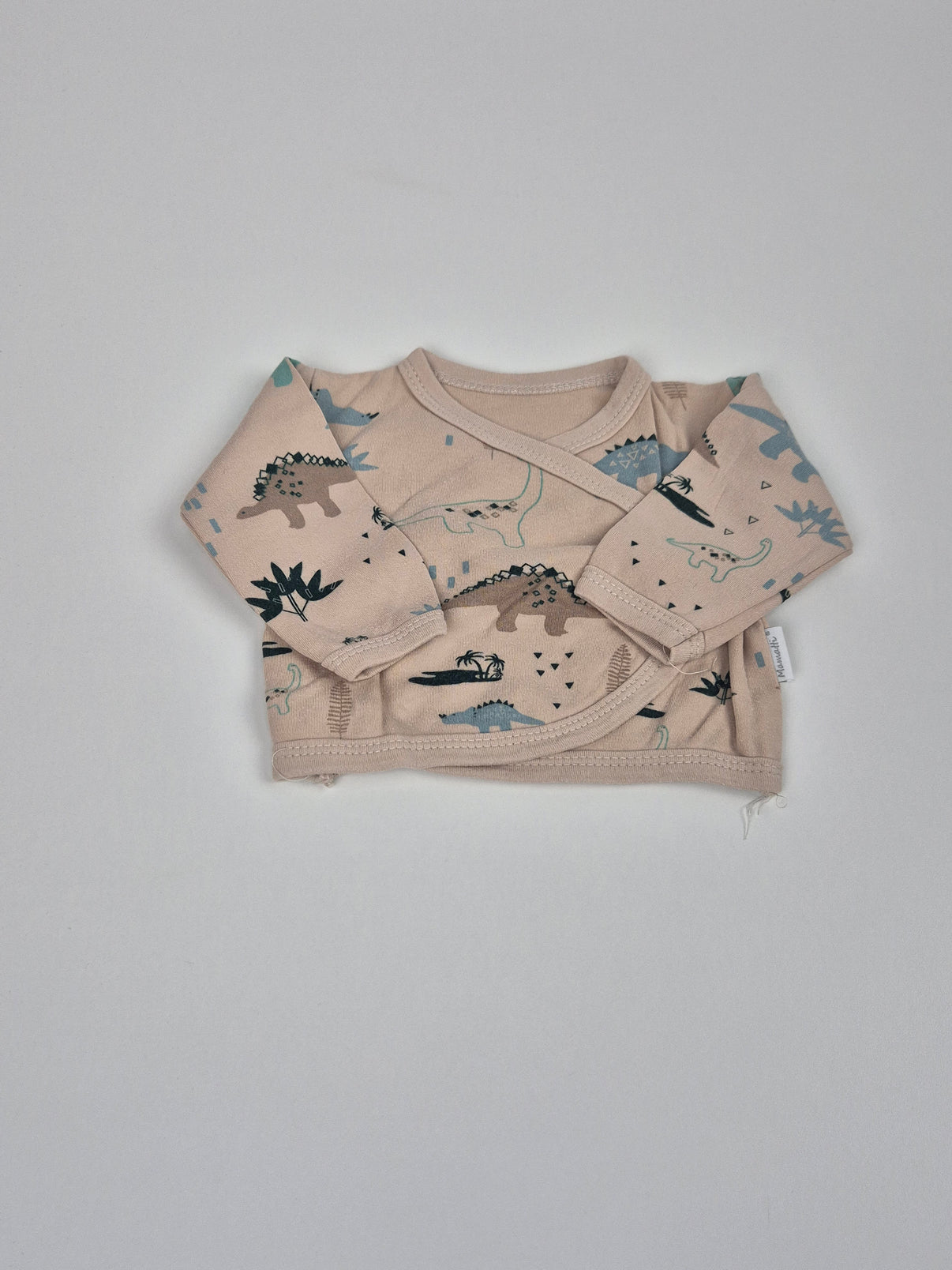 Toto zavinovací tričko značky Mamatti ve velikosti 50/56 má béžový základ s hravým potiskem dinosaurů v zeleno-modrých odstínech. Praktické zapínání na patentky na boku usnadňuje oblékání i svlékání miminka, aniž by se muselo přetahovat přes hlavičku. Díky měkkému bavlněnému materiálu je ideální pro novorozeně.