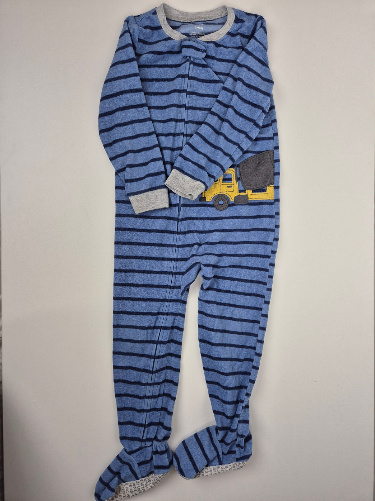 Pohodlné dupačky značky Carter's ve velikosti 104, ideální na spaní nebo lenošení doma. Modré provedení s tmavými proužky doplňuje výšivka žlutého náklaďáku, která potěší každého malého stavitele. Zip po celé délce usnadní oblékání, krytka u krku chrání proti poškrábání. Protiskluzová úprava na chodidlech dodává bezpečí při prvních krůčcích. Skvělý kousek pro chlapečka na každý den.