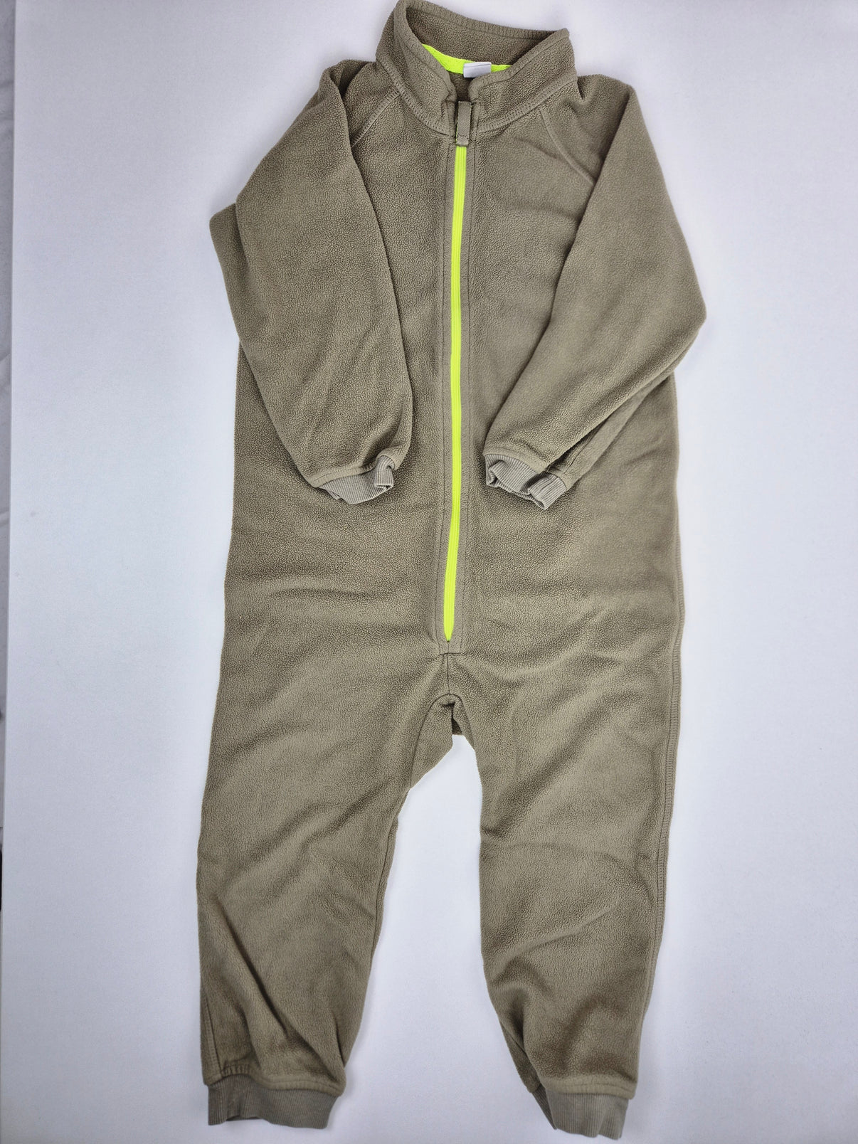 Fleecový overal H&M v béžové barvě s výrazným neonově žlutým zipem po celé délce. Stojáček u krku a pružné náplety na rukávech i nohavicích zajišťují pohodlí a lepší tepelný komfort. Měkký a hřejivý materiál je ideální pro chladné dny venku i doma.