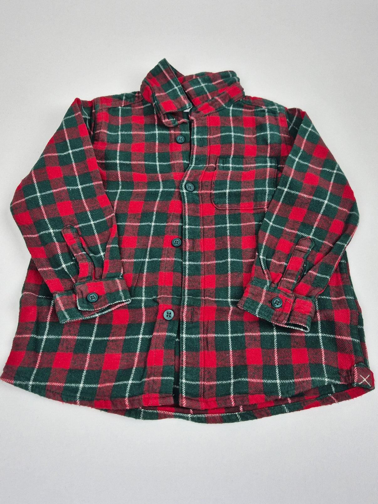 Tato kostkovaná košile značky Pepco ve velikosti 92 má klasický červeno-zelený károvaný vzor s dlouhým rukávem. Zapíná se na knoflíčky po celé délce a na hrudi má praktickou kapsičku. Měkký flanelový materiál je pohodlný a hodí se na běžné nošení i slavnostnější příležitosti. Vhodná spíše pro chlapečka.