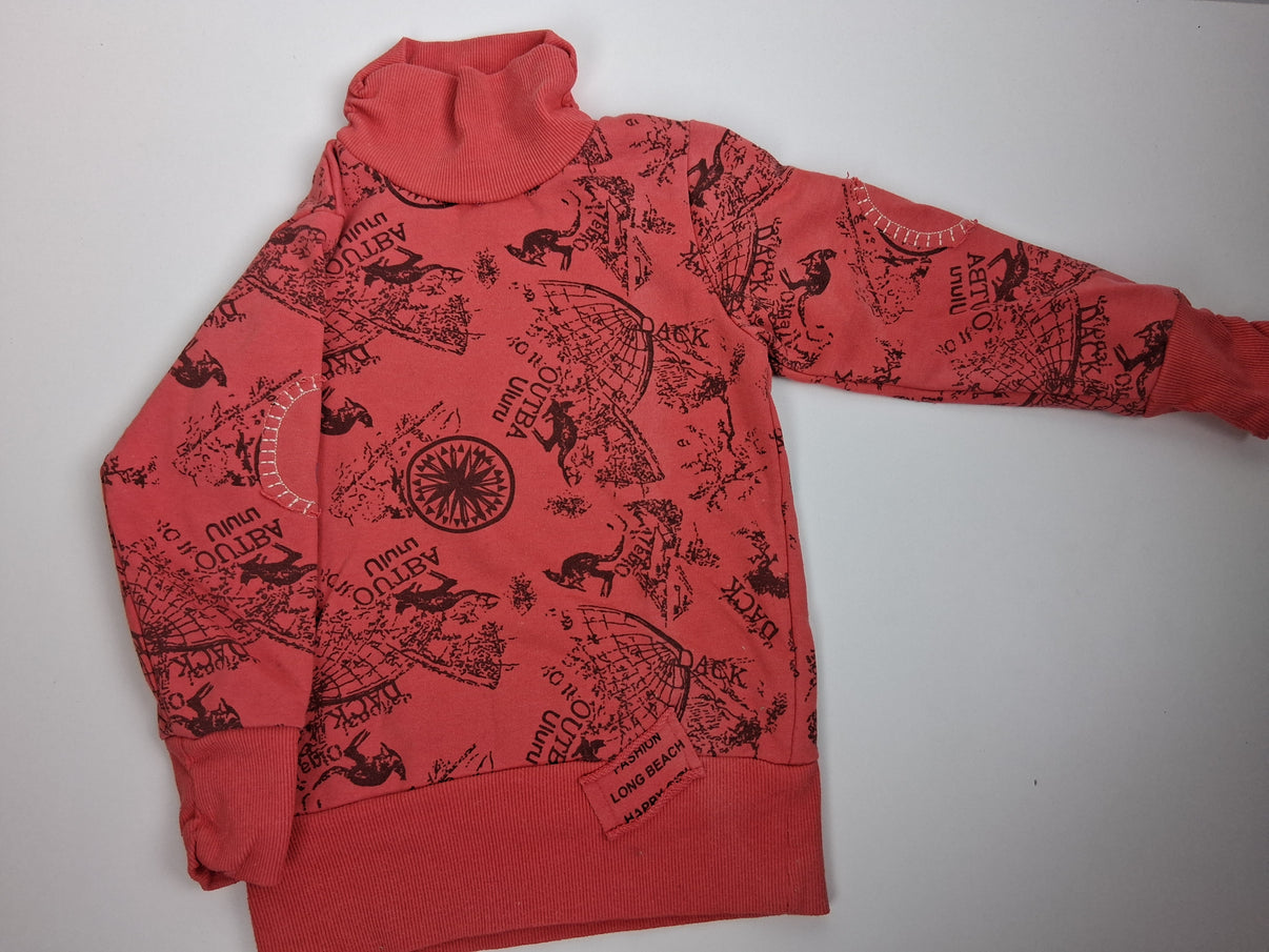 Pohodlná dětská mikina v sytě cihlové barvě s černým potiskem s motivy mapy, kompasu a klokanů, které odkazují na Austrálii – ideální pro malé dobrodruhy. Mikina má vyšší stojáček, který chrání krk před větrem, a náplety na rukávech i spodním lemu pro lepší pohodlí při nošení. Hodí se na každodenní nošení do školky, školy i na výlety do přírody. Vhodná pro kluky.