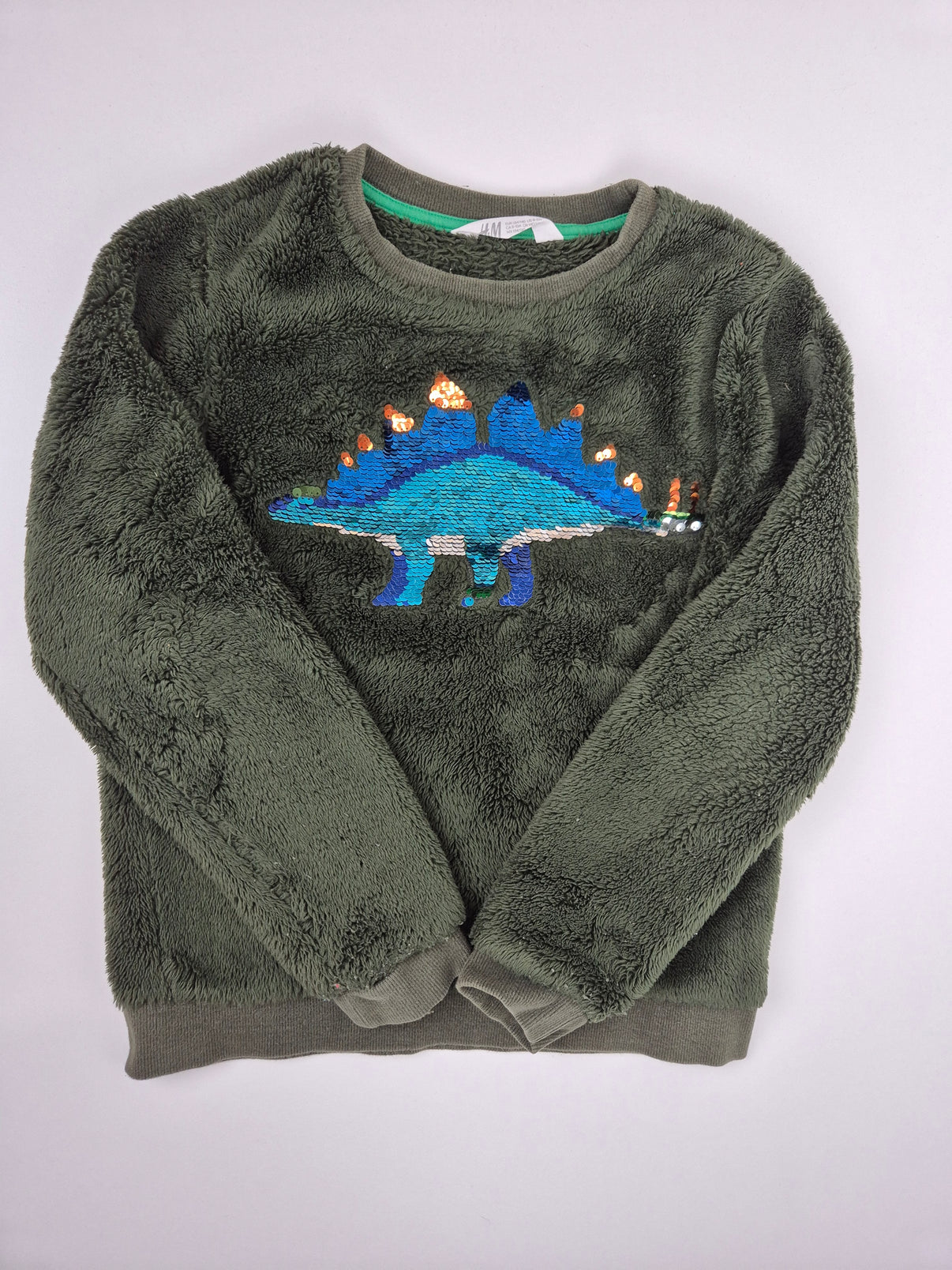Hřejivá a stylová mikina značky H&M ve velikosti 134/140, ideální pro malé milovníky dinosaurů. Mikina je ušitá z měkkého chlupatého materiálu v olivově zeleném odstínu a na hrudi ji zdobí výrazný dinosaurus ze třpytivých flitrových obrázků, které mění barvu pohybem. Pružné lemy na rukávech a spodním okraji zajistí, že dobře drží na místě. Skvělý kousek pro chlapečka do školy, na doma i na ven – teplý, pohodlný a zároveň hravý.