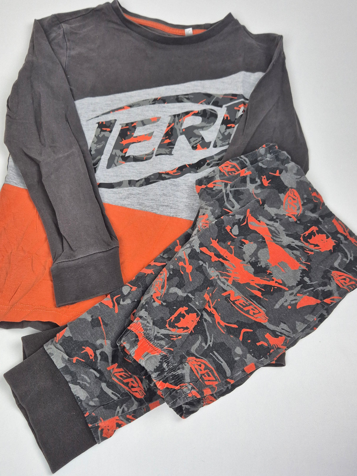Kalhoty jsou v tmavě šedém maskáčovém vzoru s oranžovým potiskem Nerf, zakončené pružnými lemy pro pohodlné nošení. Celý set je příjemný na spaní i domácí pohodu, skvělý na chladnější večery a rána. Pyžamo je určené především pro kluky.